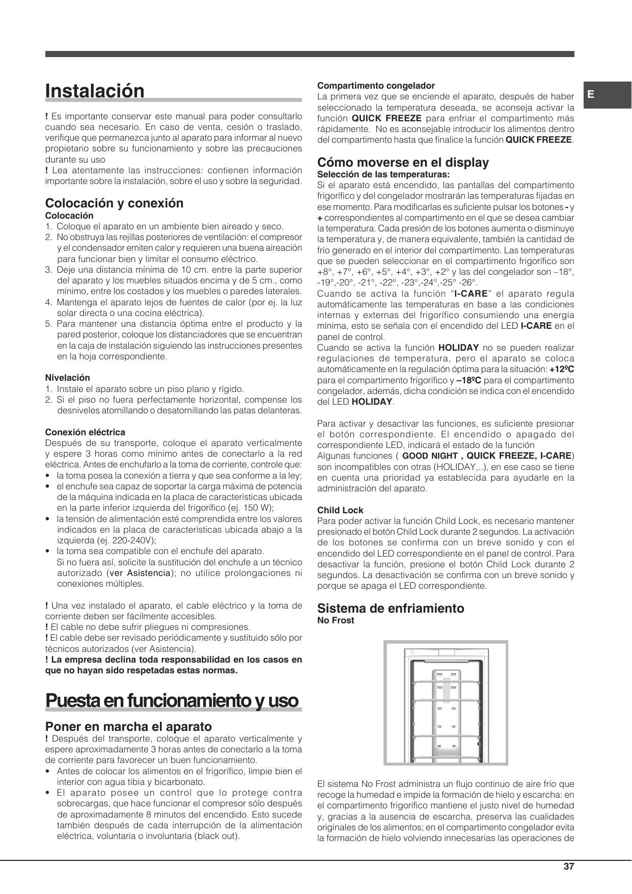 - la toma sea compatible con el enchufe del aparato. Si no fuera así, solicite la sustitución del enchufe a un técnico autorizado (ver Asistencia); no utilice prolongaciones ni conexiones múltiples. ! Una vez instalado el aparato, el cable eléctrico y la toma de corriente deben ser fácilmente accesibles. ! El cable no debe sufrir pliegues ni compresiones. ! El cable debe ser revisado periódicamente y sustituido sólo por técnicos autorizados (ver Asistencia). ! La empresa declina toda responsabilidad en los casos en que no hayan sido respetadas estas normas. Compartimento congelador La primera vez que se enciende el aparato, después de haber seleccionado la temperatura deseada, se aconseja activar la función QUICK FREEZE para enfriar el compartimento más rápidamente. No es aconsejable introducir los alimentos dentro del compartimento hasta que finalice la función QUICK FREEZE. Cómo moverse en el display Selección de las temperaturas: Si el aparato está encendido, las pantallas del compartimento frigorífico y del congelador mostrarán las temperaturas fijadas en ese momento. Para modificarlas es suficiente pulsar los botones - y + correspondientes al compartimento en el que se desea cambiar la temperatura. Cada presión de los botones aumenta o disminuye la temperatura y, de manera equivalente, también la cantidad de frío generado en el interior del compartimento. Las temperaturas que se pueden seleccionar en el compartimento frigorífico son +8°, +7°, +6°, +5°, +4°, +3°, +2° y las del congelador son –18°, -19°,-20°, -21°, -22°, -23°,-24°,-25° -26°. Cuando se activa la función “I-CARE” el aparato regula automáticamente las temperaturas en base a las condiciones internas y externas del frigorífico consumiendo una energía mínima, esto se señala con el encendido del LED I-CARE en el panel de control. Cuando se activa la función HOLIDAY no se pueden realizar regulaciones de temperatura, pero el aparato se coloca automáticamente en la regulación óptima para la situación: +12ºC para el compartimento frigorífico y –18ºC para el compartimento congelador, además, dicha condición se indica con el encendido del LED HOLIDAY. Para activar y desactivar las funciones, es suficiente presionar el botón correspondiente. El encendido o apagado del correspondiente LED, indicará el estado de la función Algunas funciones ( GOOD NIGHT , QUICK FREEZE, I-CARE) son incompatibles con otras (HOLIDAY,..), en ese caso se tiene en cuenta una prioridad ya establecida para ayudarle en la administración del aparato. Child Lock Para poder activar la función Child Lock, es necesario mantener presionado el botón Child Lock durante 2 segundos. La activación de los botones se confirma con un breve sonido y con el encendido del LED correspondiente en el panel de control. Para desactivar la función, presione el botón Child Lock durante 2 segundos. La desactivación se confirma con un breve sonido y porque se apaga el LED correspondiente. Sistema de enfriamiento No Frost Puesta en funcionamiento y uso Poner en marcha el aparato ! Después del transporte, coloque el aparato verticalmente y espere aproximadamente 3 horas antes de conectarlo a la toma de corriente para favorecer un buen funcionamiento.