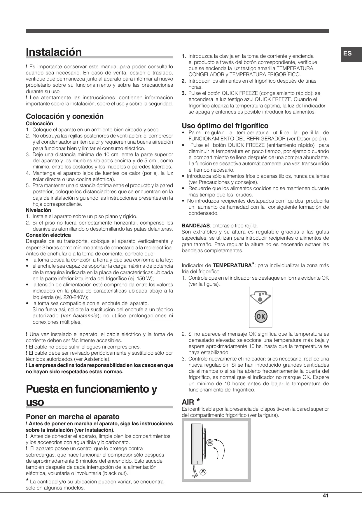 • Pa ra re gula r la tem per atur a uti li ce la pe ril la de FUNCIONAMIENTO DEL REFRIGERADOR (ver Descripción). • Pulse el botón QUICK FREEZE (enfriamiento rápido) para disminuir la temperatura en poco tiempo, por ejemplo cuando el compartimiento se llena después de una compra abundante. La función se desactiva automáticamente una vez transcurrido el tiempo necesario. • Introduzca sólo alimentos fríos o apenas tibios, nunca calientes (ver Precauciones y consejos). • Recuerde que los alimentos cocidos no se mantienen durante más tiempo que los crudos. • No introduzca recipientes destapados con líquidos: produciría un aumento de humedad con la consiguiente formación de condensado. BANDEJAS: enteras o tipo rejilla. Son extraíbles y su altura es regulable gracias a las guías especiales, se utilizan para introducir recipientes o alimentos de gran tamaño. Para regular la altura no es necesario extraer las bandejas completamentes. Indicador de TEMPERATURA*: para individualizar la zona más fría del frigorífico. 1. Controle que en el indicador se destaque en forma evidente OK (ver la figura).