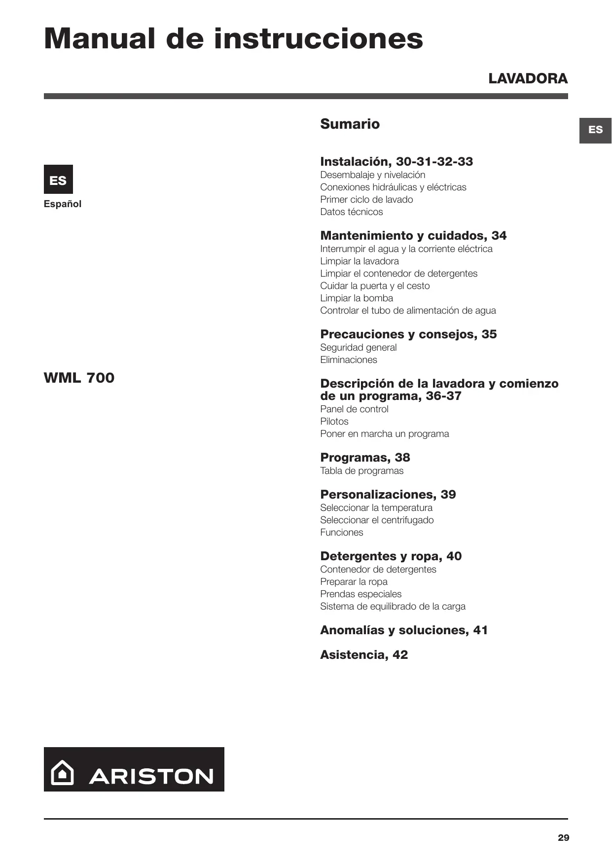 Instalaciôn, 30-31-32-33 Desembalaje y nivelacién Conexiones hidräulicas y eléctricas Primer ciclo de lavado