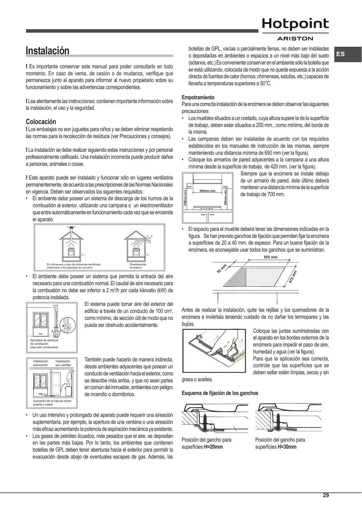 • El espacio para el mueble deberá tener las dimensiones indicadas en la figura. Se han previsto ganchos de fijación que permiten fijar la encimera a superficies de 20 a 40 mm. de espesor. Para un buena fijación de la encimera, es aconsejable usar todos los ganchos que se suministran. 555 mm