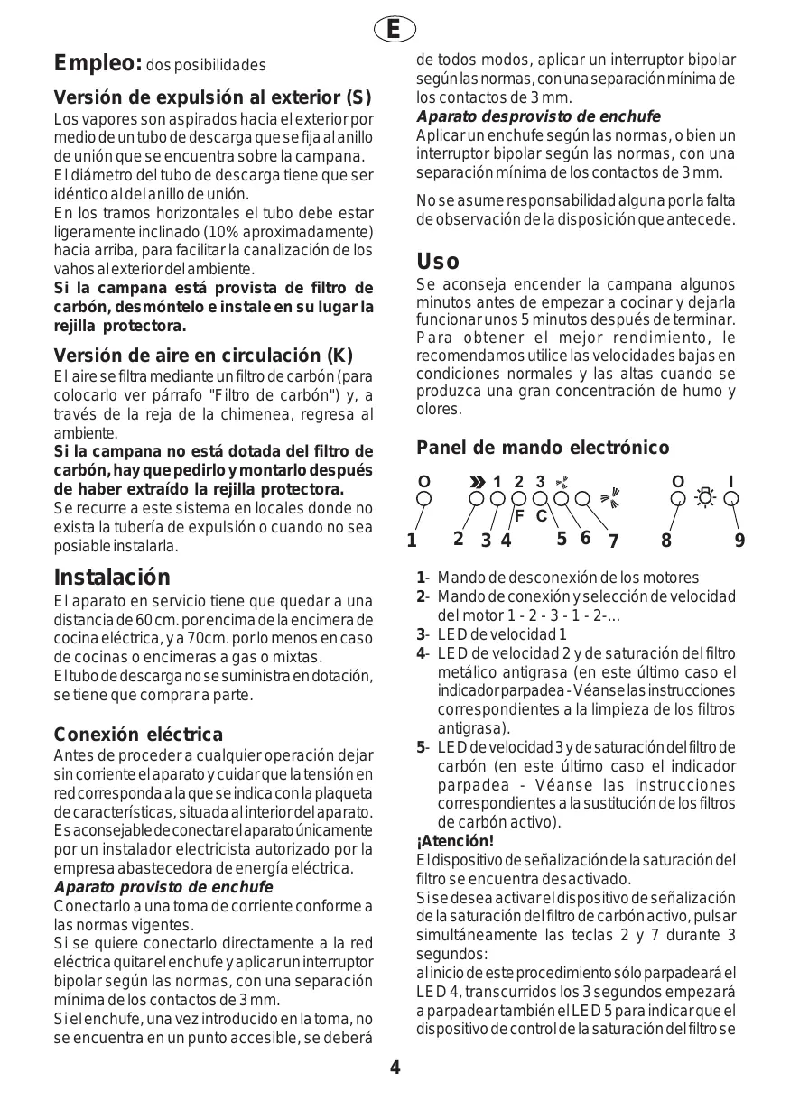 Empleo: dos posibilidades Versiôn de expulsiôn al exterior (S) Los vapores son aspirados hacia elexterior por medio de un tubo de descarga que sefija alanillo de uniôn que se encuentra sobre la campana Eldiémetro del tubo de descarga tiene que ser idéntico aldelanillo de unién. En los tramos horizontales el tubo debe estar ligeramente inclinado (10% aproximadamente) hacia arriba, para facilitar la canalizaciôn de los vahos alexterior del ambiente. Si la campana esté provista de filtro de carbôn, desméntelo e instale en su lugar la rejilla protectora. Versién de aire en circulaciôn (K) El aire se filtra mediante un filtro de carbôn (para colocarlo ver pérrafo "Filtro de carbôn") y, a través de la reja de la chimenea, regresa al ambiente. Si la campana no esté dotada del filtro de carbôn, hay que pedirlo y montarlo después de haber extraido la rejilla protectora. Se recurre a este sistema en locales donde no exista la tuberia de expulsiôn o cuando no sea posiable instalarla. Instalaciôén El aparato en servicio tiene que quedar a una distancia de 60 cm. porencima de la encimera de cocina eléctrica, ya 70cm. porlo menos en caso de cocinas o encimeras a gas o mixtas Eltubo de descarganosesuministra en dotacién, se tiene que comprar a parte. Conexién eléctrica Antes de proceder a cualquier operacién dejar sin corriente elaparato y cuidar que la tensién en red corresponda a la que se indica con la plaqueta de caracteristicas, situada alinterior delaparato. Es aconsejable de conectarelaparato Ünicamente por un instalador electricista autorizado por la empresa abastecedora de energia eléctrica. Aparato provisto de enchufe Conectarlo a una toma de corriente conforme a las normas vigentes. Sise quiere conectarlo directamente a la red eléctrica quitarelenchufe yaplicaruninterruptor bipolar segün las normas, con una separaciôn minima de los contactos de 3 mm. Sielenchufe, una vez introducido en la toma, no se encuentra en un punto accesible, se deberé de todos modos, aplicar un interruptor bipolar segünlas normas, con una separaciôn minima de los contactos de 3mm. Aparato desprovisto de enchufe Aplicarun enchufe segün las normas, o bien un interruptor bipolar segün las normas, con una separaciôn minima de los contactos de 3mm. Nose asumeresponsabilidad alguna porla falta de observaciôn de la disposicién que antecede. Uso Se aconseja encender la campana algunos minutos antes de empezar a cocinar y dejarla funcionarunos 5 minutos después de terminar. Para obtener el mejor rendimiento, le recomendamos utilice las velocidades bajas en condiciones normales y las altas cuando se produzca una gran concentracién de humo y olores. Panel de mando electrénico »123" Pire fre