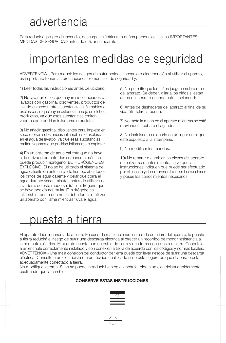 advertencia Para reducir el peligro de incendio, descargas eléctricas, o daños personales, lea las IMPORTANTES MEDIDAS DE SEGURIDAD antes de utilizar su aparato. importantes medidas de seguridad ADVERTENCIA - Para reducir los riesgos de sufrir heridas, incendio o electrocución al utilizar el aparato, es importante tomar las precauciones elementales de seguridad y: