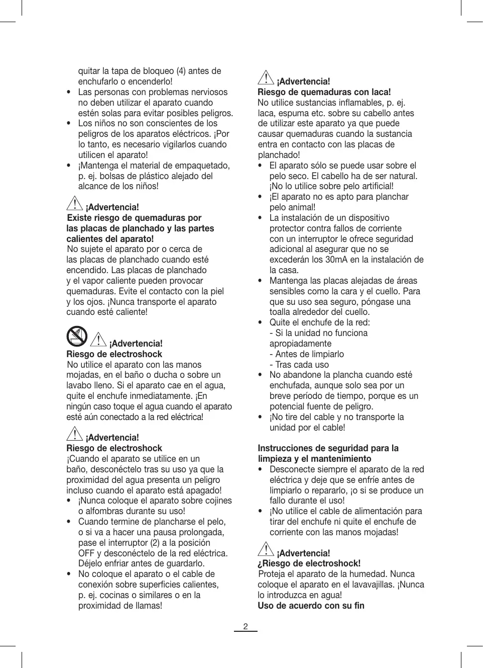 - Este aparato es para uso dométrico y no deben utiliserse para un findistincto al descririto en estemanual. Noutilice la plancha para nada que no sea alizar el pelo.
