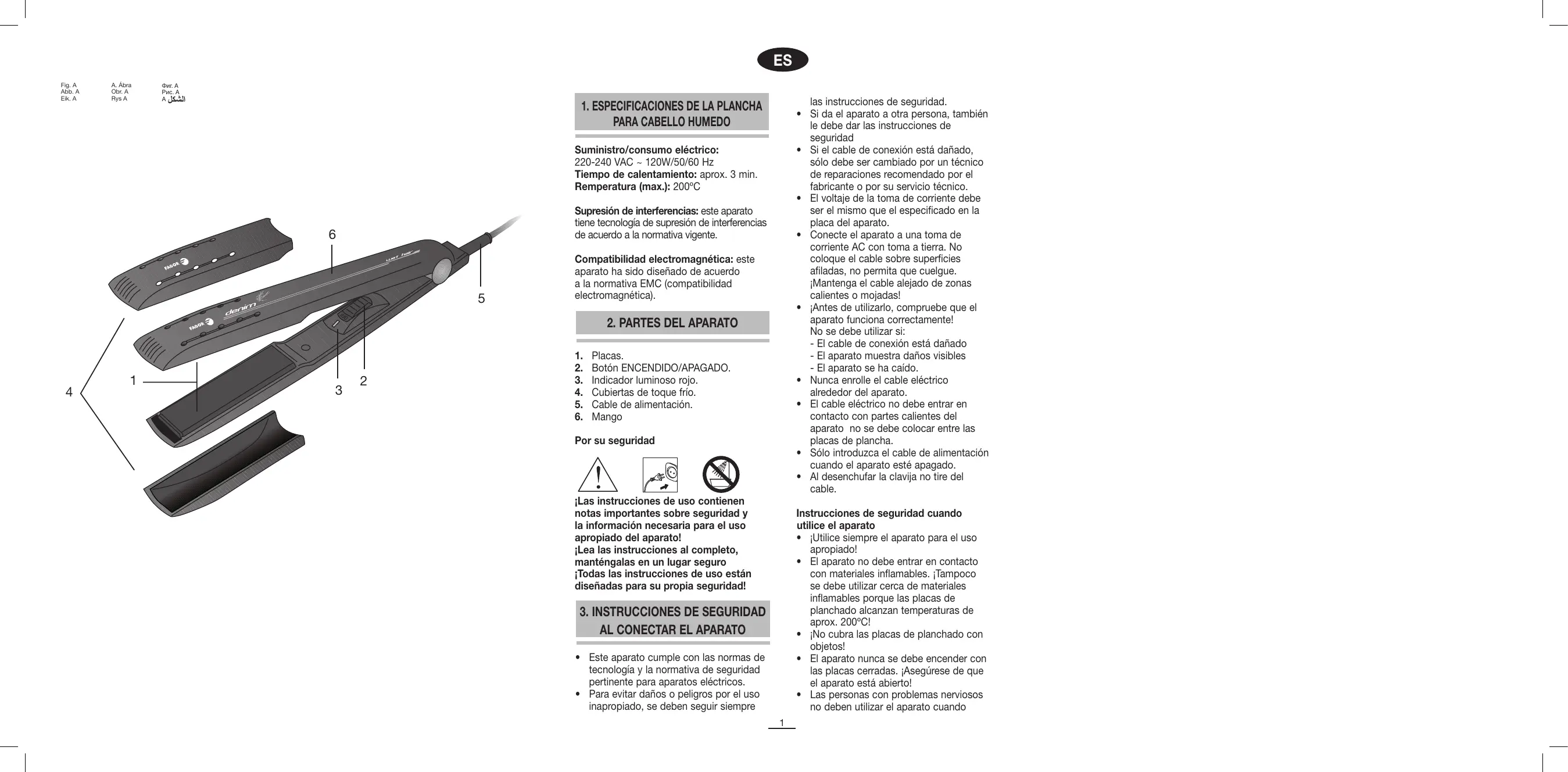- No coloque el aparato o el cable de conexión sobre superficies calientes, p. ej. cocinas o similares o en la proximidad de llamas! ¡Advertencia! ¿Riesgo de electroshock! Proteja el aparato de la humedad. Nunca coloque el aparato en el lavavajillas. ¡Nunca lo introduzca en agua! Uso de acuerdo con su fin El aparato sólo está diseñado para planchar y dar forma al pelo humano. No se aceptará responsabilidad alguna por daños resultantes del uso para otros fines, un uso inadecuado o reparaciones por inexpertos. Los servicios de garantía están excluidos en estos casos. ¡El aparato no está diseñado para usos profesionales! ¡Advertencia! Riesgo de quemaduras con laca! No utilice sustancias inflamables, p. ej.
