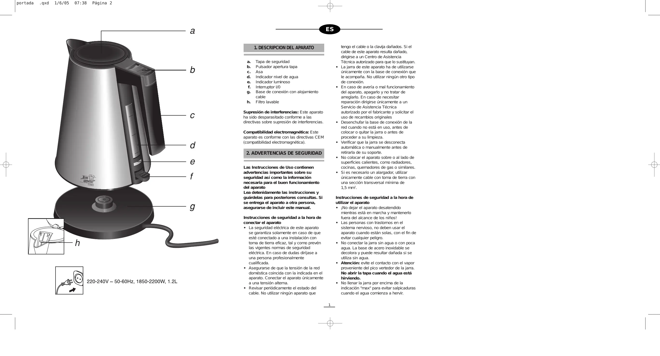 tengo el cable o la clavija dañados. Si el cable de este aparato resulta dañado, dirigirse a un Centro de Asistencia Técnica autorizado para que lo sustituyan. La jarra de este aparato ha de utilizarse únicamente con la base de conexión que le acompaña. No utilizar ningún otro tipo de conexión. En caso de avería o mal funcionamiento del aparato, apagarlo y no tratar de arreglarlo. En caso de necesitar reparación dirigirse únicamente a un Servicio de Asistencia Técnica autorizado por el fabricante y solicitar el uso de recambios originales Desenchufar la base de conexión de la red cuando no está en uso, antes de colocar o quitar la jarra o antes de proceder a su limpieza. Verificar que la jarra se desconecta automática o manualmente antes de retirarla de su soporte. No colocar el aparato sobre o al lado de superficies calientes, como radiadores, cocinas, quemadores de gas o similares. Si es necesario un alargador, utilizar únicamente cable con toma de tierra con una sección transversal mínima de 1,5 mm2. Instrucciones de seguridad a la hora de utilizar el aparato