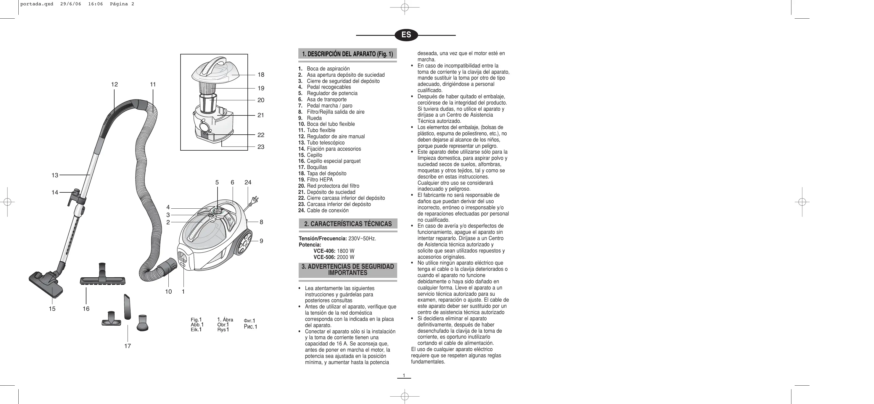 Tensión/Frecuencia: 230V~50Hz. Potencia: VCE-406: 1800 W VCE-506: 2000 W