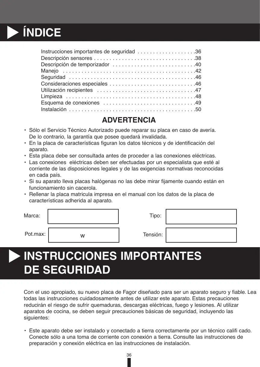 INSTRUCCIONES IMPORTANTES DE SEGURIDAD Con el uso apropiado, su nuevo placa de Fagor diseñado para ser un aparato seguro y fiable. Lea todas las instrucciones cuidadosamente antes de utilizar este aparato. Estas precauciones reducirán el riesgo de sufrir quemaduras, descargas eléctricas, fuego y lesiones. Al utilizar aparatos de cocina, se deben seguir precauciones básicas de seguridad, incluyendo las siguientes: