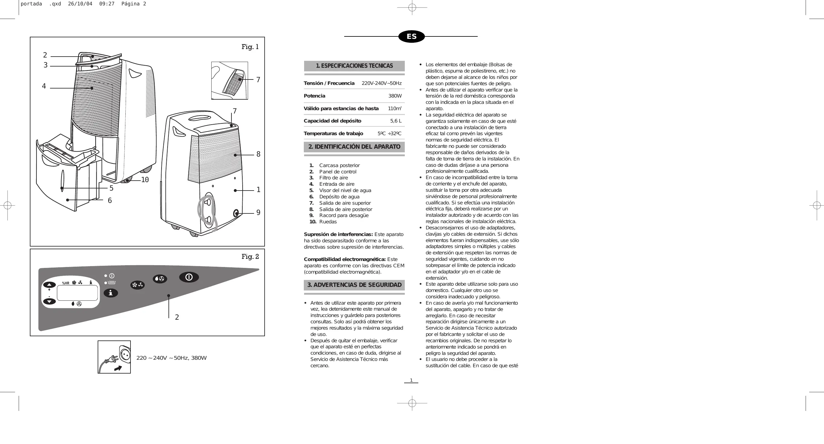 Tensión / Frecuencia 220V-240V~50Hz Potencia 380W Válido para estancias de hasta 110m2 Capacidad del depósito Temperaturas de trabajo 5,6 L 5ºC ÷32ºC