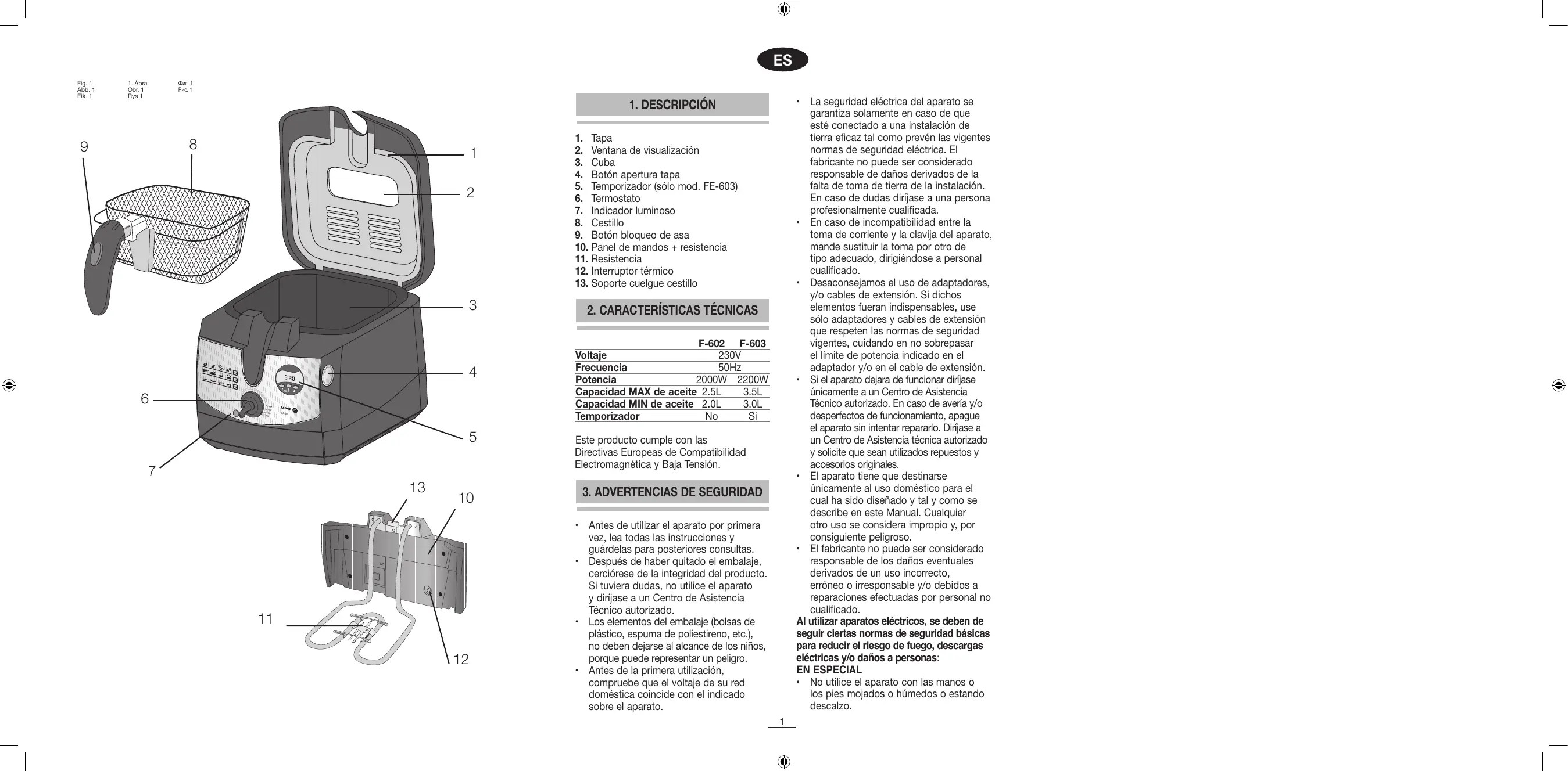 Voltaje 230V Frecuencia 50Hz Potencia 2000W 2200W Capacidad MAX de aceite 2.5L 3.5L Capacidad MIN de aceite 2.0L 3.0L Temporizador No Si Este producto cumple con las Directivas Europeas de Compatibilidad Electromagnética y Baja Tensión.