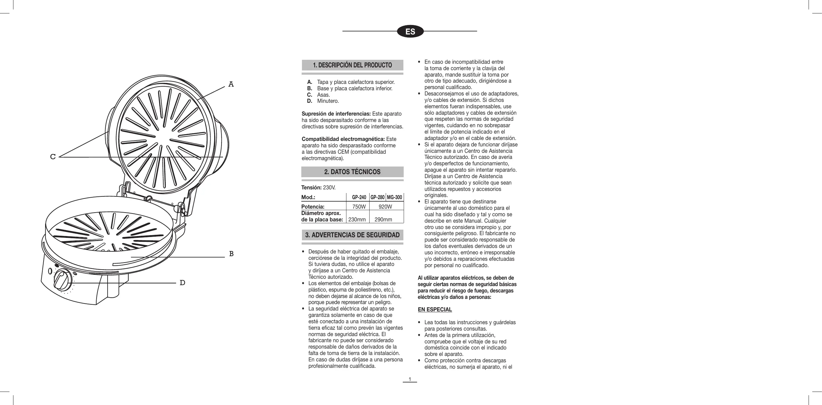 Tensión: 230V. Mod.: GP-240 GP-280 MG-300 Potencia: 750W Diámetro aprox. de la placa base: 230mm 920W 290mm