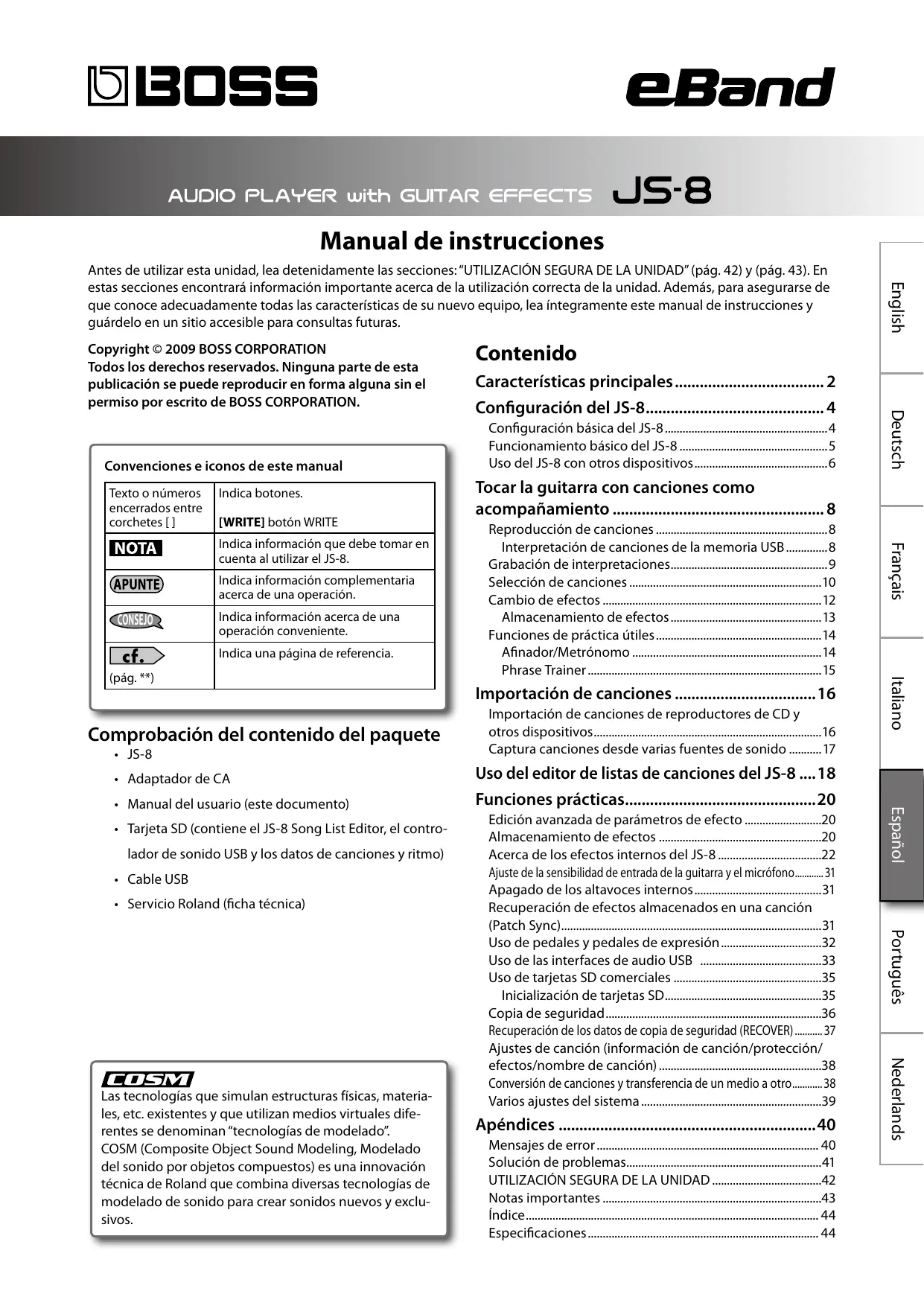 - Manual del usuario (este documento) Configuración básica del JS-8........................................................4 Funcionamiento básico del JS-8...................................................5 Uso del JS-8 con otros dispositivos..............................................6 Italiano (pág. **) Características principales..................................... 2 Configuración del JS-8............................................ 4 Français Indica información que debe tomar en cuenta al utilizar el JS-8. Contenido Deutsch Copyright © 2009 BOSS CORPORATION Todos los derechos reservados. Ninguna parte de esta publicación se puede reproducir en forma alguna sin el permiso por escrito de BOSS CORPORATION. English Antes de utilizar esta unidad, lea detenidamente las secciones: “UTILIZACIÓN SEGURA DE LA UNIDAD” (pág. 42) y (pág. 43). En estas secciones encontrará información importante acerca de la utilización correcta de la unidad. Además, para asegurarse de que conoce adecuadamente todas las características de su nuevo equipo, lea íntegramente este manual de instrucciones y guárdelo en un sitio accesible para consultas futuras.