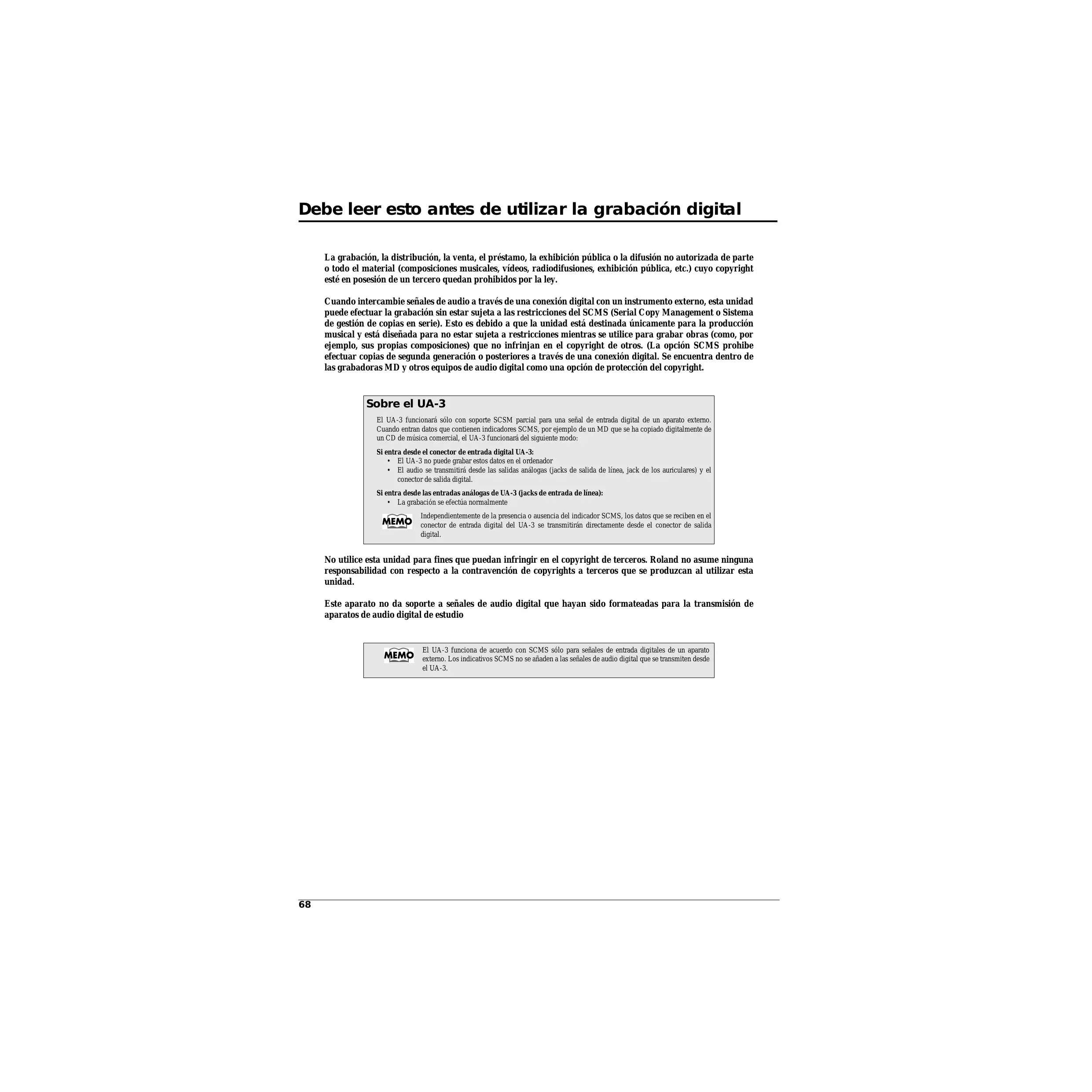 Debe leer esto antes de utilizar la grabación digital La grabación, la distribución, la venta, el préstamo, la exhibición pública o la difusión no autorizada de parte o todo el material (composiciones musicales, vídeos, radiodifusiones, exhibición pública, etc.) cuyo copyright esté en posesión de un tercero quedan prohibidos por la ley. Cuando intercambie señales de audio a través de una conexión digital con un instrumento externo, esta unidad puede efectuar la grabación sin estar sujeta a las restricciones del SCMS (Serial Copy Management o Sistema de gestión de copias en serie). Esto es debido a que la unidad está destinada únicamente para la producción musical y está diseñada para no estar sujeta a restricciones mientras se utilice para grabar obras (como, por ejemplo, sus propias composiciones) que no infrinjan en el copyright de otros. (La opción SCMS prohibe efectuar copias de segunda generación o posteriores a través de una conexión digital. Se encuentra dentro de las grabadoras MD y otros equipos de audio digital como una opción de protección del copyright. Sobre el UA-3 El UA-3 funcionará sólo con soporte SCSM parcial para una señal de entrada digital de un aparato externo. Cuando entran datos que contienen indicadores SCMS, por ejemplo de un MD que se ha copiado digitalmente de un CD de música comercial, el UA-3 funcionará del siguiente modo: Si entra desde el conector de entrada digital UA-3: