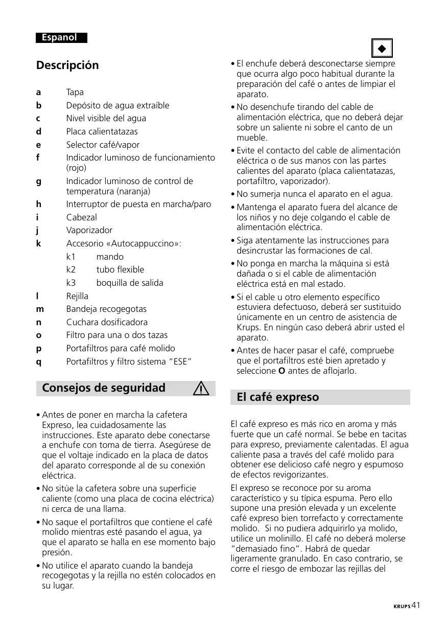 - Si el cable u otro elemento específico estuviera defectuoso, deberá ser sustituido únicamente en un centro de asistencia de Krups. En ningún caso deberá abrir usted el aparato.