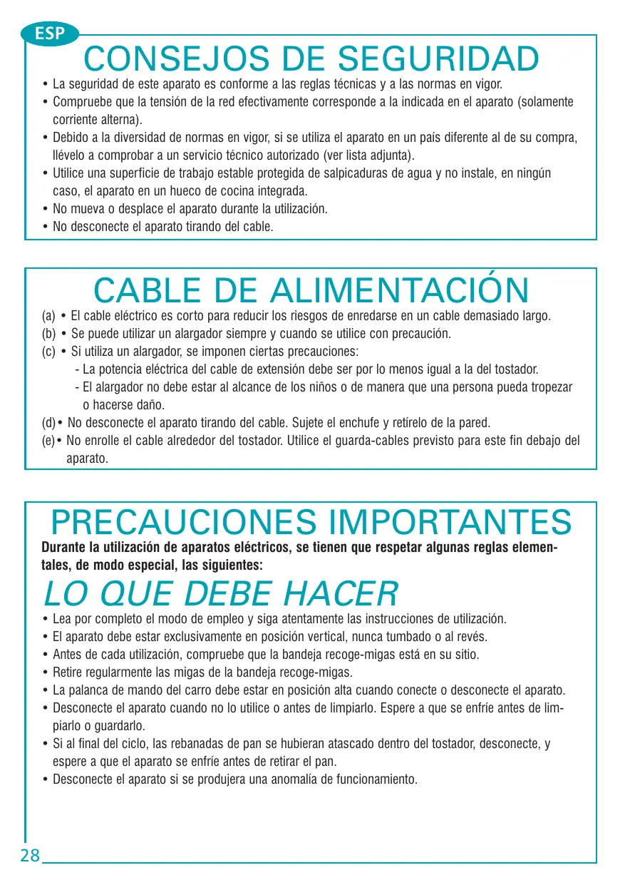 (a) • El cable eléctrico es corto para reducir los riesgos de enredarse en un cable demasiado largo. (b) • Se puede utilizar un alargador siempre y cuando se utilice con precaución. (c) • Si utiliza un alargador, se imponen ciertas precauciones: - La potencia eléctrica del cable de extensión debe ser por lo menos igual a la del tostador. - El alargador no debe estar al alcance de los niños o de manera que una persona pueda tropezar o hacerse daño. (d)• No desconecte el aparato tirando del cable. Sujete el enchufe y retírelo de la pared. (e)• No enrolle el cable alrededor del tostador. Utilice el guarda-cables previsto para este fin debajo del aparato. PRECAUCIONES IMPORTANTES Durante la utilización de aparatos eléctricos, se tienen que respetar algunas reglas elementales, de modo especial, las siguientes: