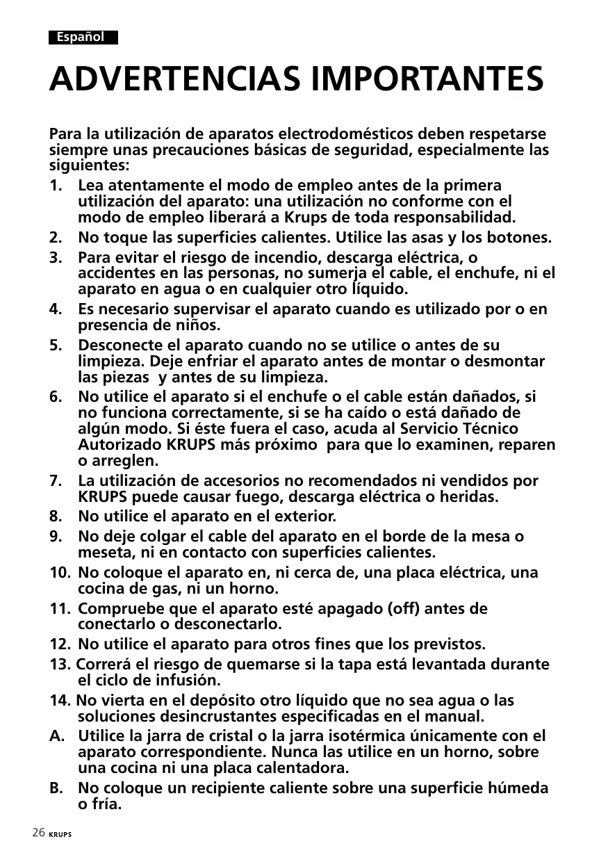 C. Nunca utilice un recipiente con fisuras o con el asa dañada. D. No utilice estropajos, ni materiales abrasivos para la limpieza de la jarra. E. Este aparato está destinado a uso doméstico. Todas las intervenciones que no sean la limpieza y el mantenimiento mencionados en el manual, deberán ser realizados por un Servicio Técnico Autorizado Krups. F. Para evitar el deterioro del recubrimiento de cristal de la jarra isotérmica de plástico, no introduzca utensilios agresivos en el interior, no introduzca tampoco hielo ni azúcar, a no ser que lo haga delicadamente y haya líquido en el interior. G. No introduzca nunca la mano en el interior de la jarra isotérmica de cristal. H. Nunca meta la jarra isotérmica en el horno microondas ni en el lavavajillas. CONSERVE ESTAS INSTRUCCIONES