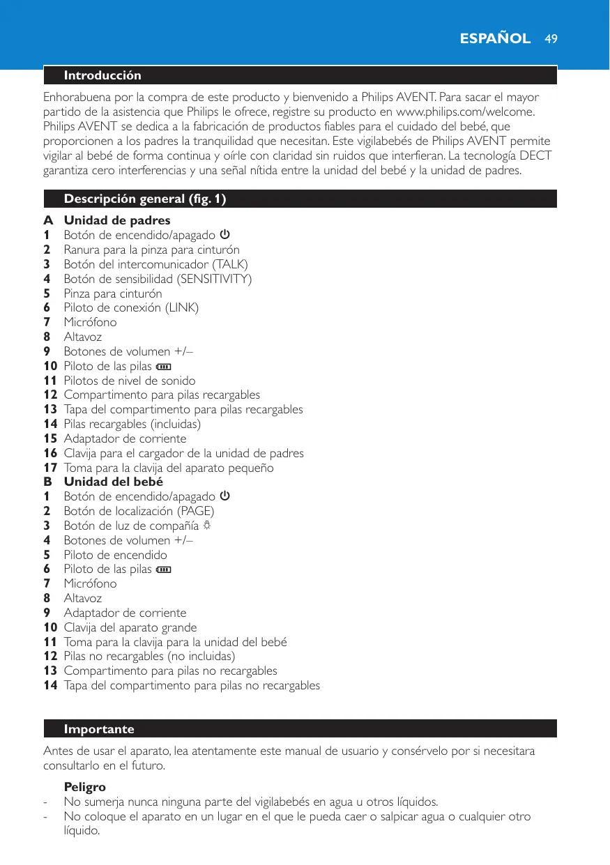 Español 49 Introducción Enhorabuena por la compra de este producto y bienvenido a Philips AVENT. Para sacar el mayor partido de la asistencia que Philips le ofrece, registre su producto en www.philips.com/welcome. Philips AVENT se dedica a la fabricación de productos fiables para el cuidado del bebé, que proporcionen a los padres la tranquilidad que necesitan. Este vigilabebés de Philips AVENT permite vigilar al bebé de forma continua y oírle con claridad sin ruidos que interfieran. La tecnología DECT garantiza cero interferencias y una señal nítida entre la unidad del bebé y la unidad de padres. Descripción general (fig. 1)