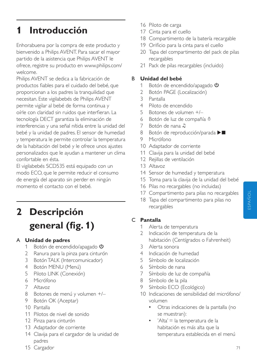 Piloto de carga Cinta para el cuello Compartimento de la batería recargable Orificio para la cinta para el cuello Tapa del compartimento del pack de pilas recargables 21 Pack de pilas recargables (incluido) Enhorabuena por la compra de este producto y bienvenido a Philips AVENT. Para sacar el mayor partido de la asistencia que Philips AVENT le ofrece, registre su producto en www.philips.com/ welcome. Philips AVENT se dedica a la fabricación de productos fiables para el cuidado del bebé, que proporcionan a los padres la tranquilidad que necesitan. Este vigilabebés de Philips AVENT permite vigilar al bebé de forma continua y oírle con claridad sin ruidos que interfieran. La tecnología DECT garantiza la eliminación de interferencias y una señal nítida entre la unidad del bebé y la unidad de padres. El sensor de humedad y temperatura le permite controlar la temperatura de la habitación del bebé y le ofrece unos ajustes personalizados que le ayudan a mantener un clima confortable en ésta. El vigilabebés SCD535 está equipado con un modo ECO, que le permite reducir el consumo de energía del aparato sin perder en ningún momento el contacto con el bebé. 2 Descripción general (fig. 1) A Unidad de padres 1 Botón de encendido/apagado 3 2 Ranura para la pinza para cinturón 3 Botón TALK (Intercomunicador) 4 Botón MENU (Menú) 5 Piloto LINK (Conexión) 6 Micrófono 7 Altavoz 8 Botones de menú y volumen +/– 9 Botón OK (Aceptar) 10 Pantalla 11 Pilotos de nivel de sonido 12 Pinza para cinturón 13 Adaptador de corriente 14 Clavija para el cargador de la unidad de padres 15 Cargador