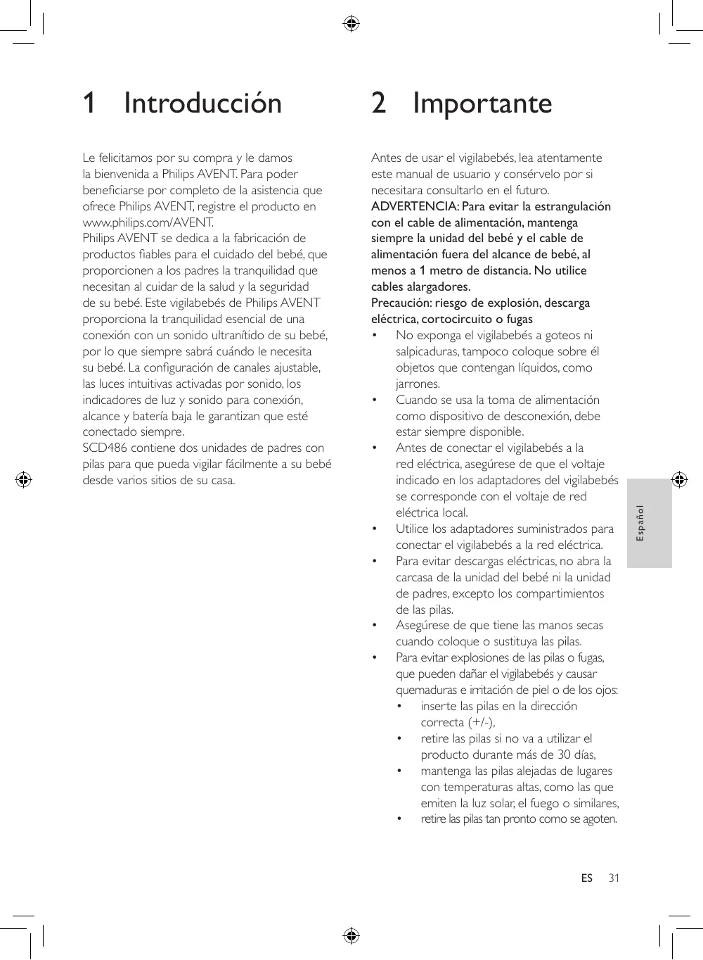 Fig.1 Le felicitamos por su compra y le damos la bienvenida a Philips AVENT. Para poder beneficiarse por completo de la asistencia que ofrece Philips AVENT, registre el producto en www.philips.com/AVENT. Philips AVENT se dedica a la fabricación de productos fiables para el cuidado del bebé, que proporcionen a los padres la tranquilidad que necesitan al cuidar de la salud y la seguridad de su bebé. Este vigilabebés de Philips AVENT proporciona la tranquilidad esencial de una conexión con un sonido ultranítido de su bebé, por lo que siempre sabrá cuándo le necesita su bebé. La configuración de canales ajustable, las luces intuitivas activadas por sonido, los indicadores de luz y sonido para conexión, alcance y batería baja le garantizan que esté conectado siempre. SCD486 contiene dos unidades de padres con pilas para que pueda vigilar fácilmente a su bebé desde varios sitios de su casa. Antes de usar el vigilabebés, lea atentamente este manual de usuario y consérvelo por si necesitara consultarlo en el futuro. ADVERTENCIA: Para evitar la estrangulación con el cable de alimentación, mantenga siempre la unidad del bebé y el cable de alimentación fuera del alcance de bebé, al menos a 1 metro de distancia. No utilice cables alargadores. Precaución: riesgo de explosión, descarga eléctrica, cortocircuito o fugas