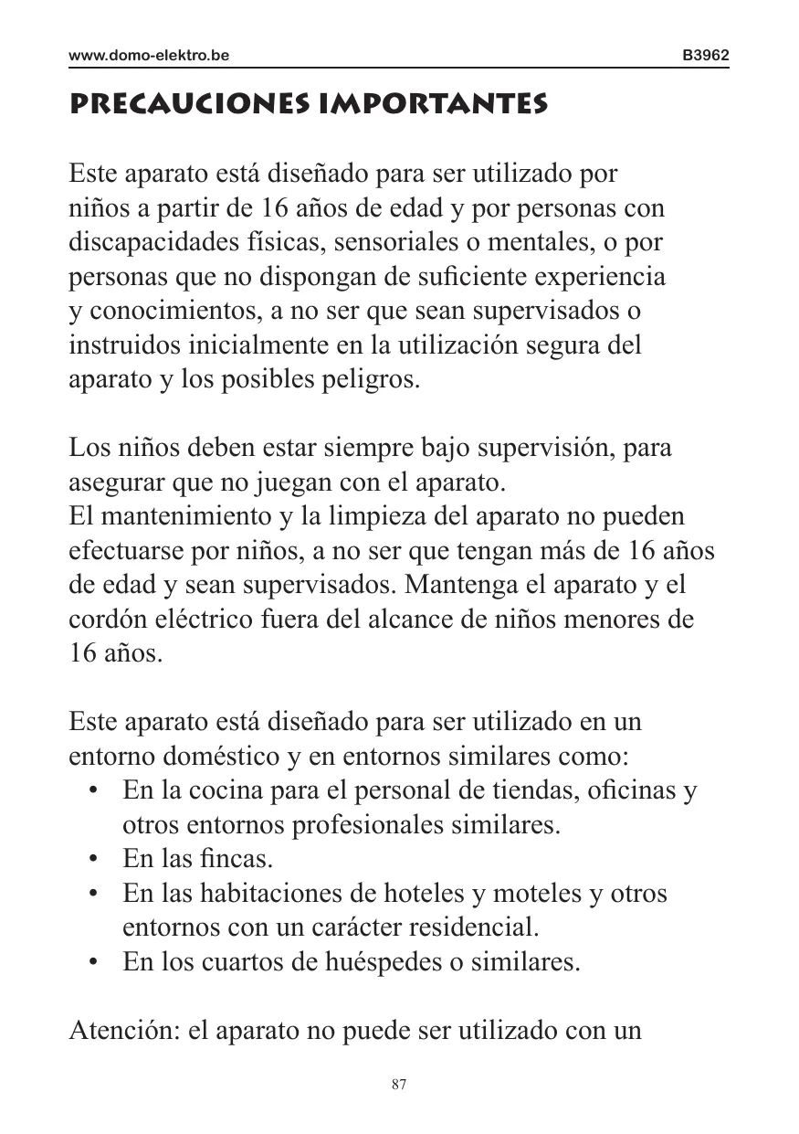 PRECAUCIONES IMPORTANTES Este aparato está diseñado para ser utilizado por niños a partir de 16 años de edad y por personas con discapacidades físicas, sensoriales o mentales, o por personas que no dispongan de suficiente experiencia y conocimientos, a no ser que sean supervisados o instruidos inicialmente en la utilización segura del aparato y los posibles peligros. Los niños deben estar siempre bajo supervisión, para asegurar que no juegan con el aparato. El mantenimiento y la limpieza del aparato no pueden efectuarse por niños, a no ser que tengan más de 16 años de edad y sean supervisados. Mantenga el aparato y el cordón eléctrico fuera del alcance de niños menores de 16 años. Este aparato está diseñado para ser utilizado en un entorno doméstico y en entornos similares como: