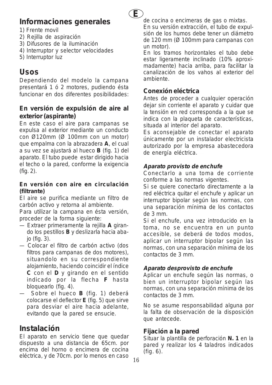 Frente movil Rejilla de aspiración Difusores de la iluminación Interruptor y selector velocidades Interruptor luz Usos Dependiendo del modelo la campana presentará 1 ó 2 motores, pudiendo ésta funcionar en dos diferentes posibilidades: Conexión eléctrica Antes de proceder a cualquier operación dejar sin corriente el aparato y cuidar que la tensión en red corresponda a la que se indica con la plaqueta de características, situada al interior del aparato. Es aconsejable de conectar el aparato únicamente por un instalador electricista autorizado por la empresa abastecedora de energía eléctrica. En versión de expulsión de aire al exterior (aspirante) En este caso el aire para campanas se expulsa al exterior mediante un conducto con Ø120mm (Ø 100mm con un motor) que empalma con la abrazadera A, el cual a su vez se ajustará al hueco B (fig. 1) del aparato. El tubo puede estar dirigido hacia el techo o la pared, conforme la exigencia (fig. 2). Aparato provisto de enchufe Conectarlo a una toma de corriente conforme a las normas vigentes. Si se quiere conectarlo directamente a la red eléctrica quitar el enchufe y aplicar un interruptor bipolar según las normas, con una separación mínima de los contactos de 3 mm. Si el enchufe, una vez introducido en la toma, no se encuentra en un punto accesible, se deberá de todos modos, aplicar un interruptor bipolar según las normas, con una separación mínima de los contactos de 3 mm. En versión con aire en circulación (filtrante) El aire se purifica mediante un filtro de carbón activo y retorna al ambiente. Para utilizar la campana en ésta versión, proceder de la forma siguiente: — Extraer primeramente la rejilla A girando los pestillos B y deslizarla hacia abajo (fig. 3). — Colocar el filtro de carbón activo (dos filtros para campanas de dos motores), situandolo en su correspondiente alojamiento, haciendo coincidir el índice C con el D y girando en el sentido indicado por la flecha F hasta bloquearlo (fig. 4). — Sobre el hueco B (fig. 1) deberá colocarse el deflector E (fig. 5) que sirve para desviar el aire hacia adelante, evitando que la pared se ensucie. Aparato desprovisto de enchufe Aplicar un enchufe según las normas, o bien un interruptor bipolar según las normas, con una separación mínima de los contactos de 3 mm. No se asume responsabilidad alguna por la falta de observación de la disposición que antecede. Instalación El aparato en servicio tiene que quedar dispuesto a una distancia de 65cm. por encima del horno o encimera de cocina eléctrica, y de 70cm. por lo menos en caso de cocina o encimeras de gas o mixtas. En su versión extracción, el tubo de expulsión de los humos debe tener un diámetro de 120 mm (Ø 100mm para campanas con un motor). En los tramos horizontales el tubo debe estar ligeramente inclinado (10% aproximadamente) hacia arriba, para facilitar la canalización de los vahos al exterior del ambiente. Fijación a la pared Situar la plantilla de perforación N. 1 en la pared y realizar los 4 taladros indicados (fig. 6).