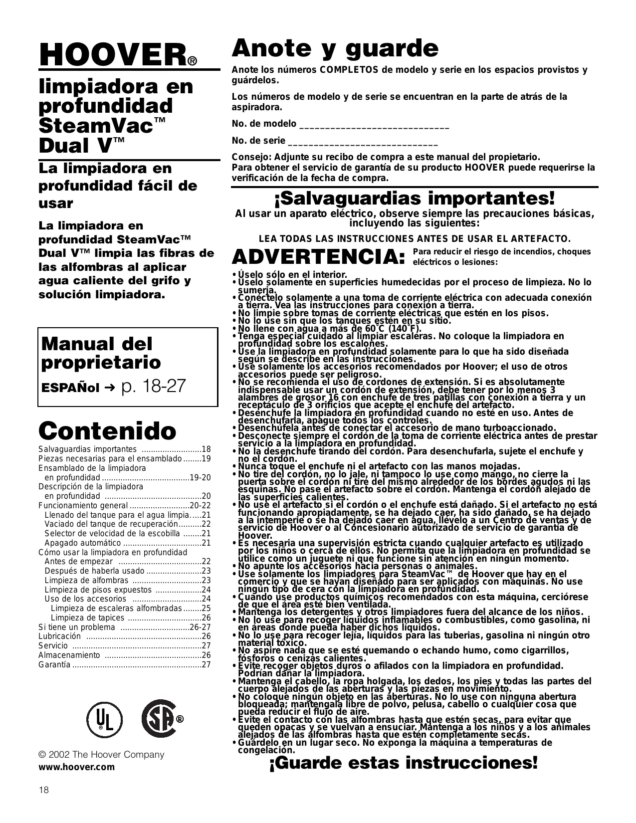 - limpiadora en profundidad SteamVac™ Dual V™ La limpiadora en profundidad fácil de usar La limpiadora en profundidad SteamVac™ Dual V™ limpia las fibras de las alfombras al aplicar agua caliente del grifo y solución limpiadora. Manual del proprietario ESPAÑol ➜ p. 18-27 Contenido Salvaguardias importantes p. 18