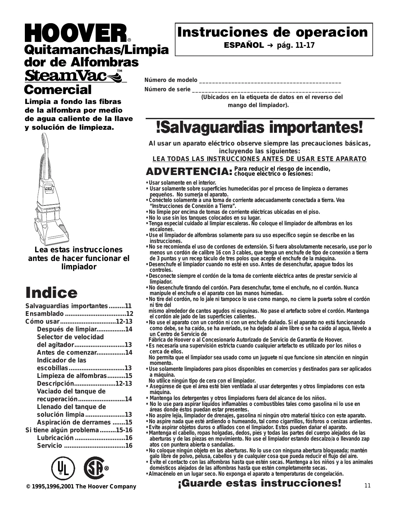 - Número de modelo ____________________________________________ Comercial Limpia a fondo las fibras de la alfombra por medio de agua caliente de la llave y solución de limpieza. Número de serie ______________________________________________ (Ubicados en la etiqueta de datos en el reverso del mango del limpiador). !Salvaguardias importantes! Al usar un aparato eléctrico observe siempre las precauciones básicas, incluyendo las siguientes: LEA TODAS LAS INSTRUCCIONES ANTES DE USAR ESTE APARATO reducir el riesgo de incendio, ADVERTENCIA: Para choque eléctrico o lesiones: Lea estas instrucciones antes de hacer funcionar el limpiador Indice Salvaguardias importantes p. 11