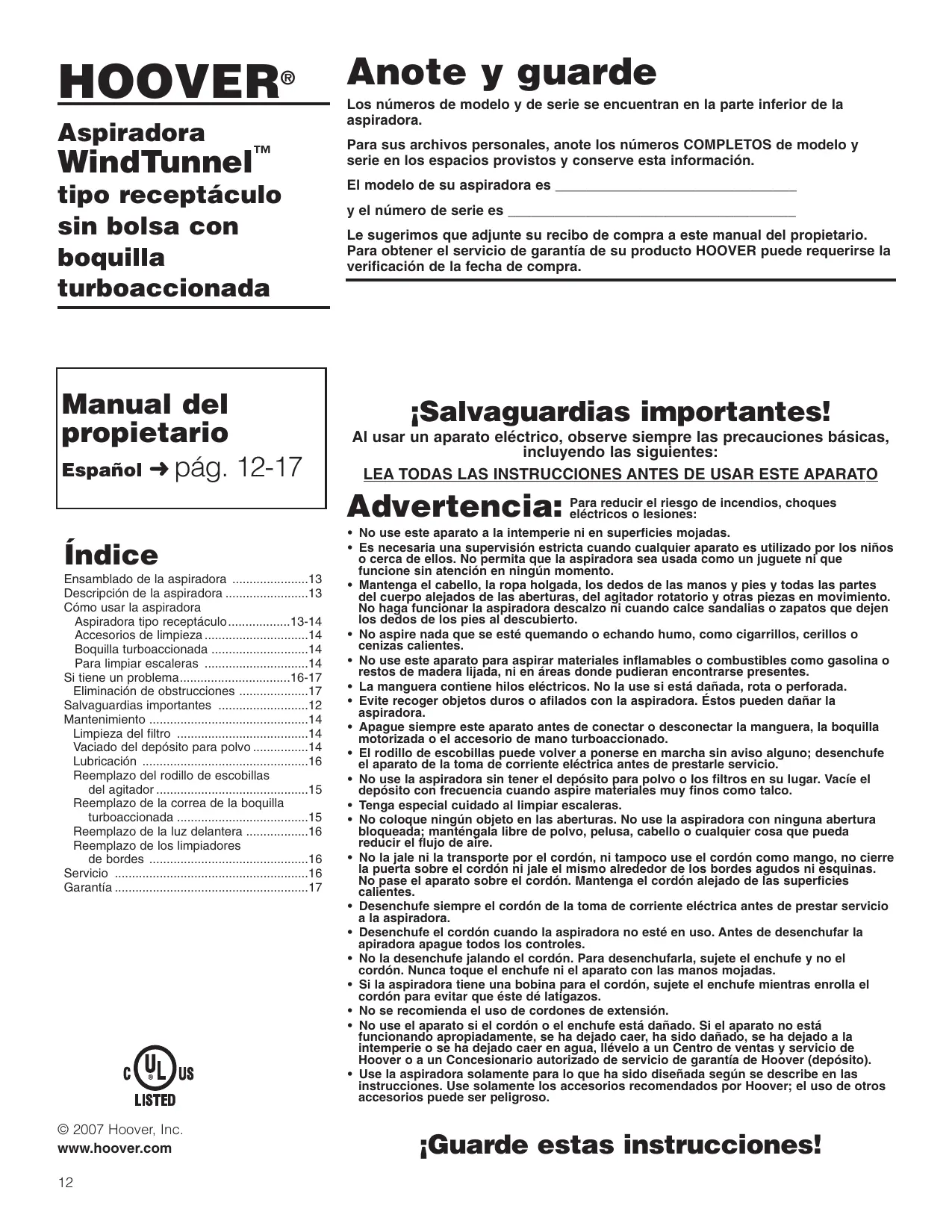 Le sugerimos que adjunte su recibo de compra a este manual del propietario. Para obtener el servicio de garantía de su producto HOOVER puede requerirse la verificación de la fecha de compra.