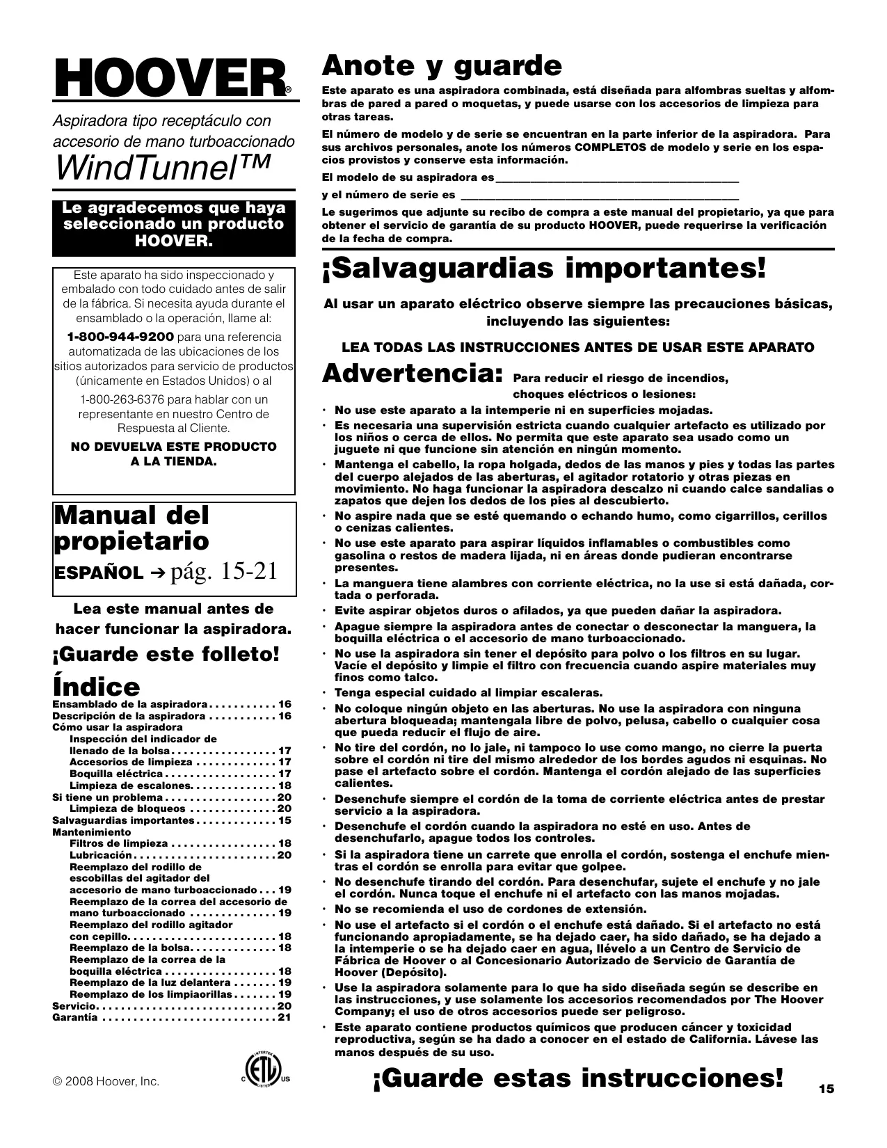 HOOVER®. Este aparato ha sido inspeccionado y embalado con todo cuidado antes de salir de la fábrica. Si necesita ayuda durante el ensamblado o la operación, llame al: 1-800-944-9200 para una referencia automatizada de las ubicaciones de los sitios autorizados para servicio de productos (únicamente en Estados Unidos) o al 1-800-263-6376 para hablar con un representante en nuestro Centro de Respuesta al Cliente. NO DEVUELVA ESTE PRODUCTO A LA TIENDA.