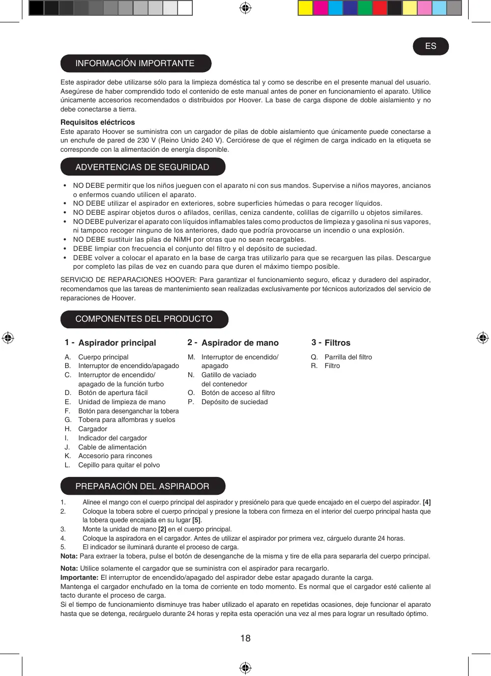 ES Información importante Este aspirador debe utilizarse sólo para la limpieza doméstica tal y como se describe en el presente manual del usuario. Asegúrese de haber comprendido todo el contenido de este manual antes de poner en funcionamiento el aparato. Utilice únicamente accesorios recomendados o distribuidos por Hoover. La base de carga dispone de doble aislamiento y no debe conectarse a tierra.