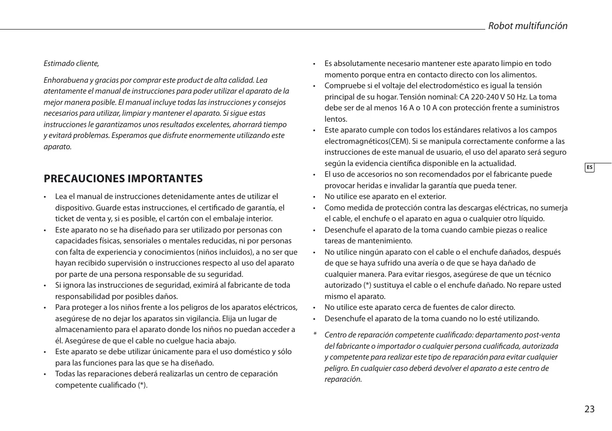 - Este aparato no se ha disnado para ser utilisé por personas con capacities ficas, sensoriales o mentalares reduidas, ni por personas con falta de experiencia y conocimientos (niños inclusidos), a no ser que hayan recibido supervisión o instrucciones respecto al uso del aparato por parte de una persona responsable de su seguridad.