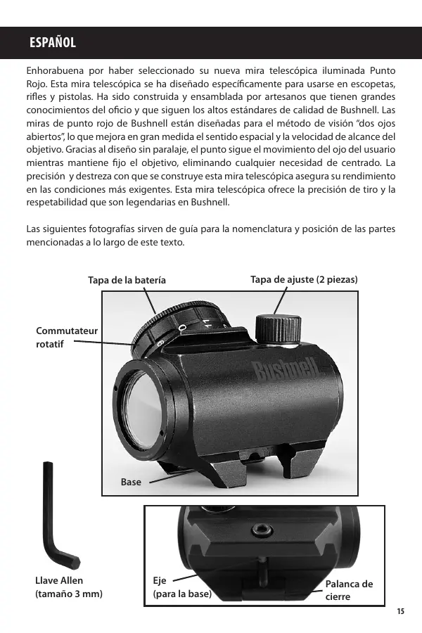 Español Enhorabuena por haber seleccionado su nueva mira telescópica iluminada Punto Rojo. Esta mira telescópica se ha diseñado específicamente para usarse en escopetas, rifles y pistolas. Ha sido construida y ensamblada por artesanos que tienen grandes conocimientos del oficio y que siguen los altos estándares de calidad de Bushnell. Las miras de punto rojo de Bushnell están diseñadas para el método de visión “dos ojos abiertos”, lo que mejora en gran medida el sentido espacial y la velocidad de alcance del objetivo. Gracias al diseño sin paralaje, el punto sigue el movimiento del ojo del usuario mientras mantiene fijo el objetivo, eliminando cualquier necesidad de centrado. La precisión y destreza con que se construye esta mira telescópica asegura su rendimiento en las condiciones más exigentes. Esta mira telescópica ofrece la precisión de tiro y la respetabilidad que son legendarias en Bushnell. Las siguientes fotografías sirven de guía para la nomenclatura y posición de las partes mencionadas a lo largo de este texto. Tapa de la batería Tapa de ajuste (2 piezas) Commutateur rotatif Base Llave Allen (tamaño 3 mm) Eje (para la base) Palanca de cierre