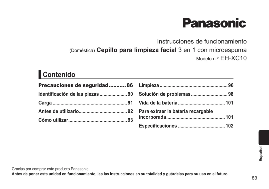 EHXC10 - Cepillo limpiador facial PANASONIC - Manual de uso y guía de instrucciones gratis
