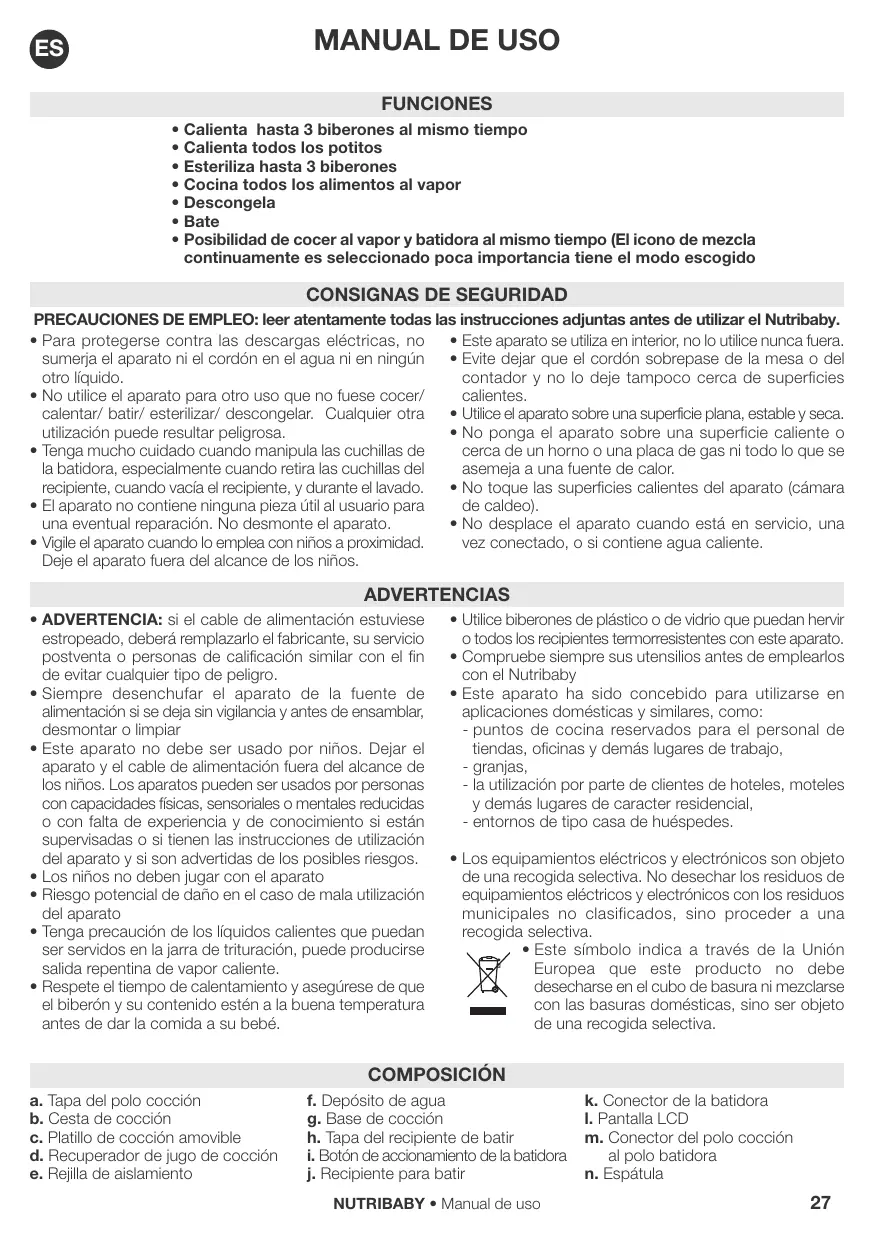 • Compruebe siempre sus utensilios antes de emplearlos con el Nutribaby • Este aparato ha sido concebido para utilizarse en aplicaciones domésticas y similares, como: - puntos de cocina reservados para el personal de tiendas, oficinas y demás lugares de trabajo, - granjas, - la utilización por parte de clientes de hoteles, moteles y demás lugares de caracter residencial, - entornos de tipo casa de huéspedes. • Los equipamientos eléctricos y electrónicos son objeto de una recogida selectiva. No desechar los residuos de equipamientos eléctricos y electrónicos con los residuos municipales no clasificados, sino proceder a una recogida selectiva. • Este símbolo indica a través de la Unión Europea que este producto no debe desecharse en el cubo de basura ni mezclarse con las basuras domésticas, sino ser objeto de una recogida selectiva.