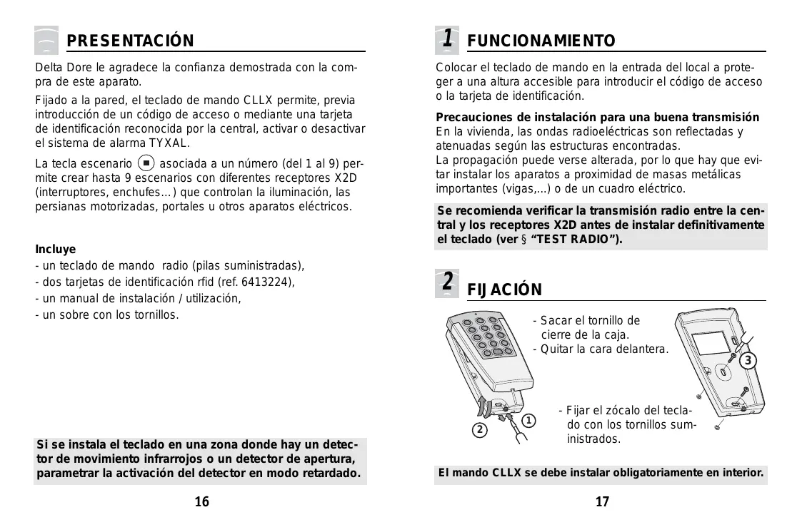 Zona de detección de las tarjetas Tornillo de cierre de la caja Badges rfid Tarjetas rfid INHALT PRÉSENTATION PRESENTACIÓN Delta Dore le agradece la confianza demostrada con la compra de este aparato. Fijado a la pared, el teclado de mando CLLX permite, previa introducción de un código de acceso o mediante una tarjeta de identificación reconocida por la central, activar o desactivar el sistema de alarma TYXAL. La tecla escenario asociada a un número (del 1 al 9) permite crear hasta 9 escenarios con diferentes receptores X2D (interruptores, enchufes…) que controlan la iluminación, las persianas motorizadas, portales u otros aparatos eléctricos. Incluye - un teclado de mando radio (pilas suministradas), - dos tarjetas de identificación rfid (ref. 6413224), - un manual de instalación / utilización, - un sobre con los tornillos. FUNCIONAMIENTO Colocar el teclado de mando en la entrada del local a proteger a una altura accesible para introducir el código de acceso o la tarjeta de identificación. Precauciones de instalación para una buena transmisión En la vivienda, las ondas radioeléctricas son reflectadas y atenuadas según las estructuras encontradas. La propagación puede verse alterada, por lo que hay que evitar instalar los aparatos a proximidad de masas metálicas importantes (vigas,...) o de un cuadro eléctrico. Se recomienda verificar la transmisión radio entre la central y los receptores X2D antes de instalar definitivamente el teclado (ver § “TEST RADIO”).