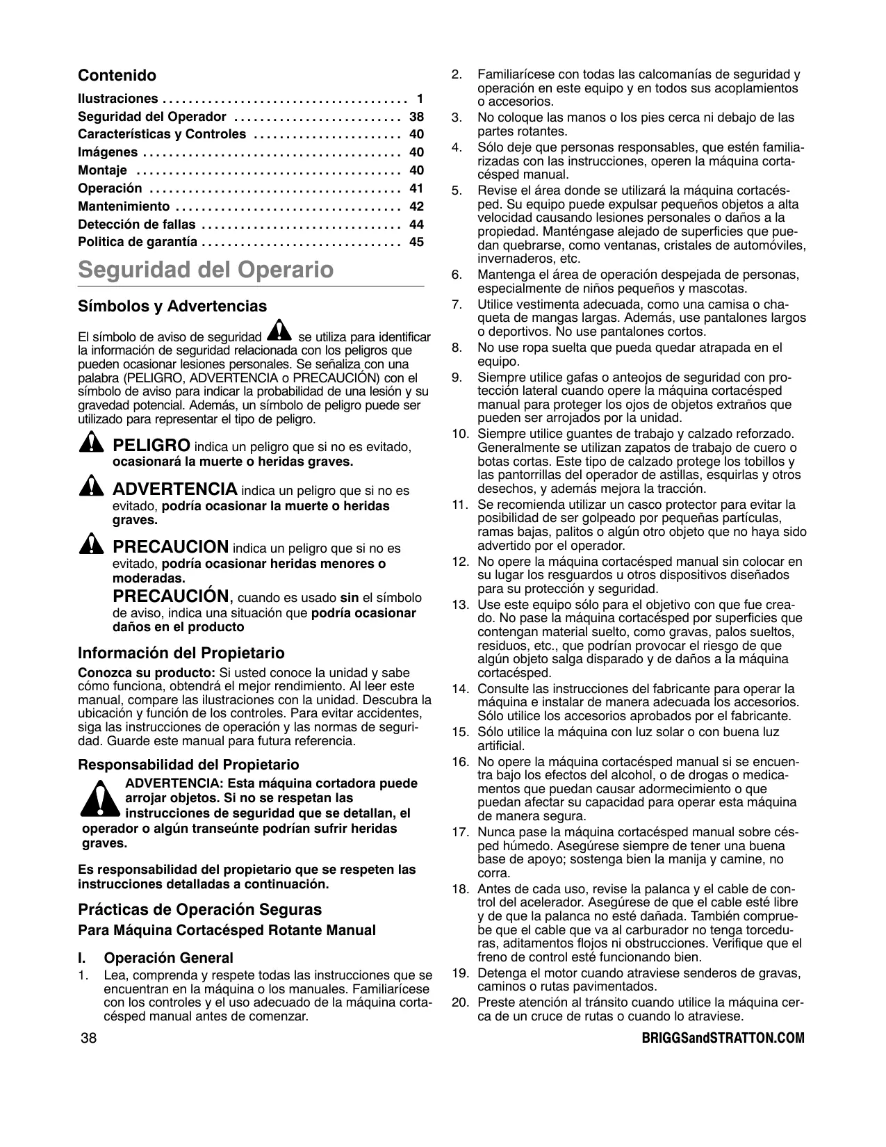 Contenido Ilustraciones . . . . . . . . . . . . . . . . . . . . . . . . . . . . . . . . . . . . . . 1 Seguridad del Operador . . . . . . . . . . . . . . . . . . . . . . . . . . 38 Características y Controles . . . . . . . . . . . . . . . . . . . . . . . 40 Imágenes . . . . . . . . . . . . . . . . . . . . . . . . . . . . . . . . . . . . . . . . 40 Montaje . . . . . . . . . . . . . . . . . . . . . . . . . . . . . . . . . . . . . . . . . 40 Operación . . . . . . . . . . . . . . . . . . . . . . . . . . . . . . . . . . . . . . . 41 Mantenimiento . . . . . . . . . . . . . . . . . . . . . . . . . . . . . . . . . . . 42 Detección de fallas . . . . . . . . . . . . . . . . . . . . . . . . . . . . . . . 44 Politica de garantía . . . . . . . . . . . . . . . . . . . . . . . . . . . . . . . 45