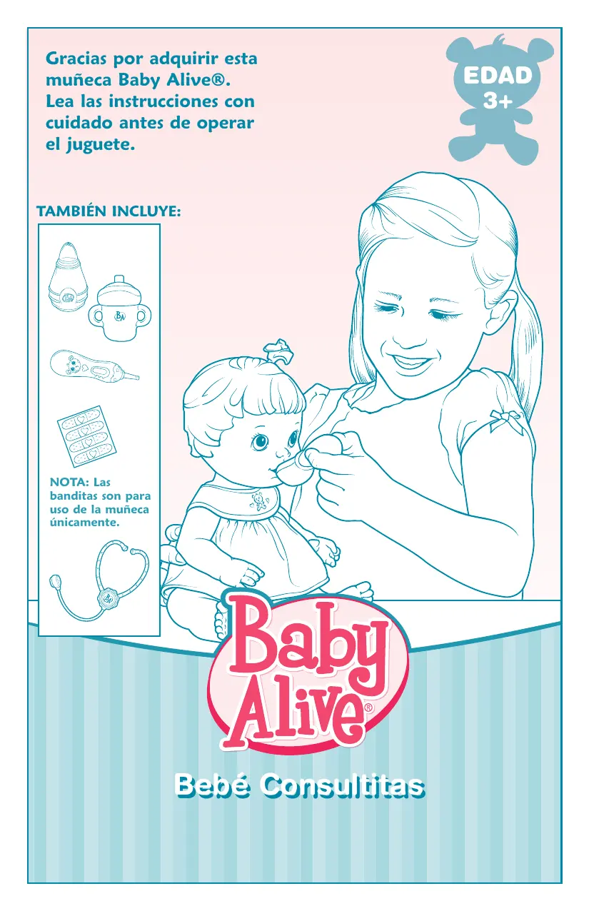 Gracias por adquirir esta muñeca Baby Alive®. Lea las instrucciones con cuidado antes de operar el juguete. TAMBIÉN INCLUYE: NOTA: Las banditas son para uso de la muñeca únicamente. PARA JUGAR Termómetro Introduce el “termómetro” dentro de la boca de la muñeca. Mostrará que tiene “fiebre”. Biberón Ver instrucciones para la hora de comer más adelante. Cuchara para la medicina Inclina la cuchara un poco hacia abajo y la “medicina” desaparece. Aspirador Aprieta la perilla para limpiarle la “nariz congestionada” a tu muñeca.