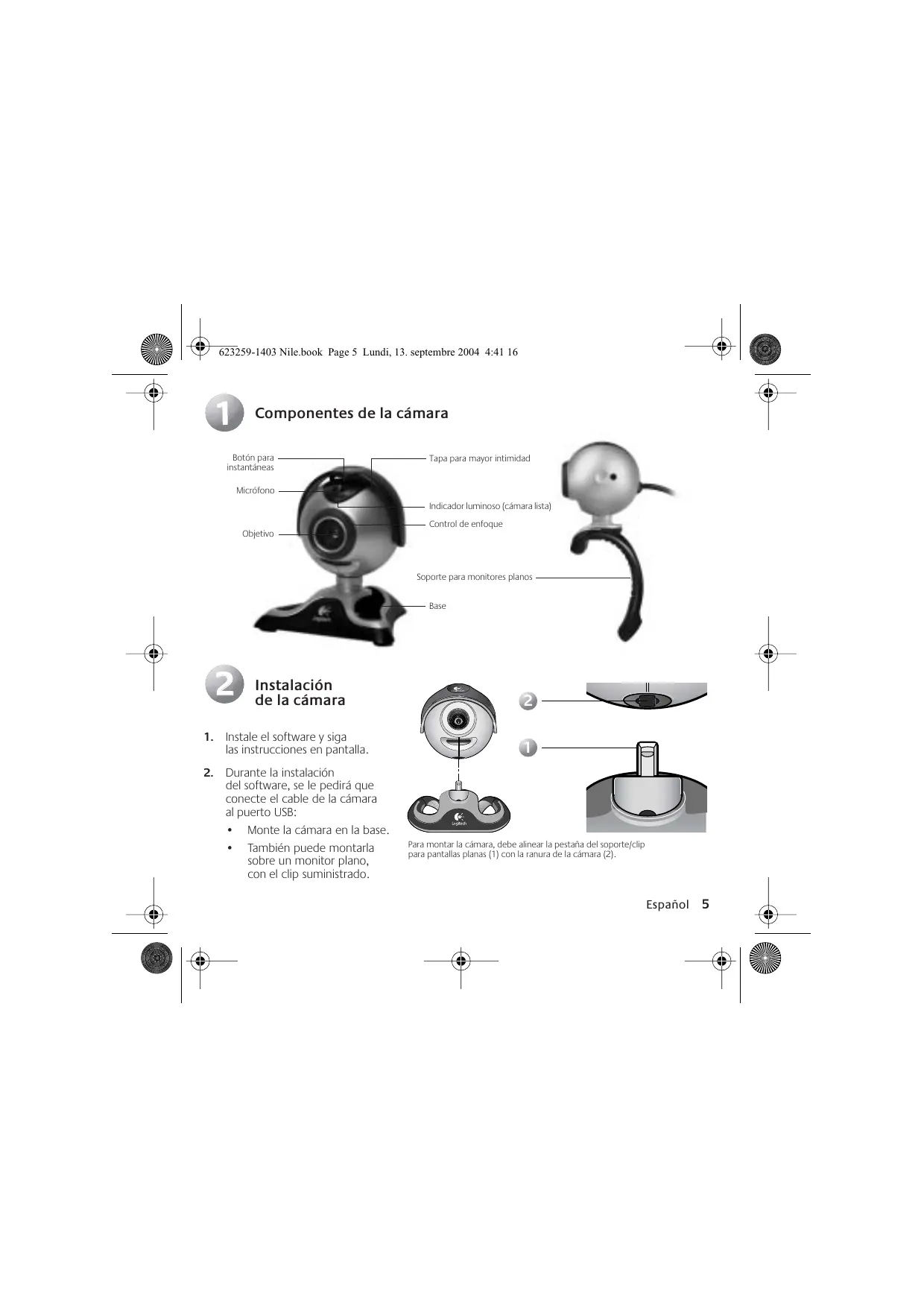 Para montar la cámara, debe alinear la pestaña del soporte/clip para pantallas planas (1) con la ranura de la cámara (2). Español