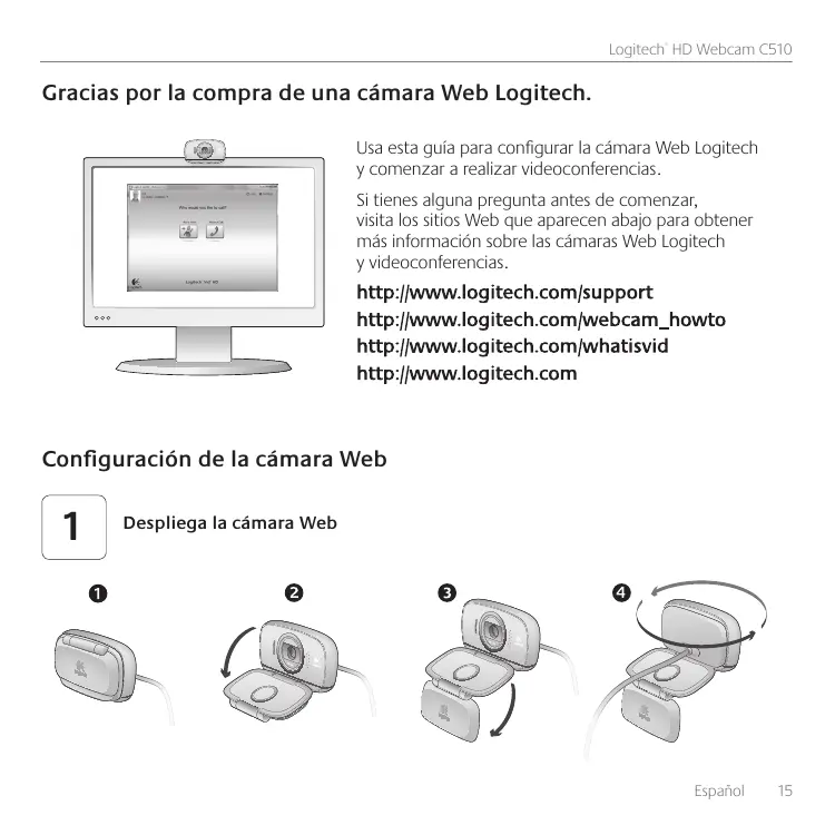 Gracias por la compra de una cámara Web Logitech. Usa esta guía para configurar la cámara Web Logitech y comenzar a realizar videoconferencias. Si tienes alguna pregunta antes de comenzar, visita los sitios Web que aparecen abajo para obtener más información sobre las cámaras Web Logitech y videoconferencias. Configuración de la cámara Web