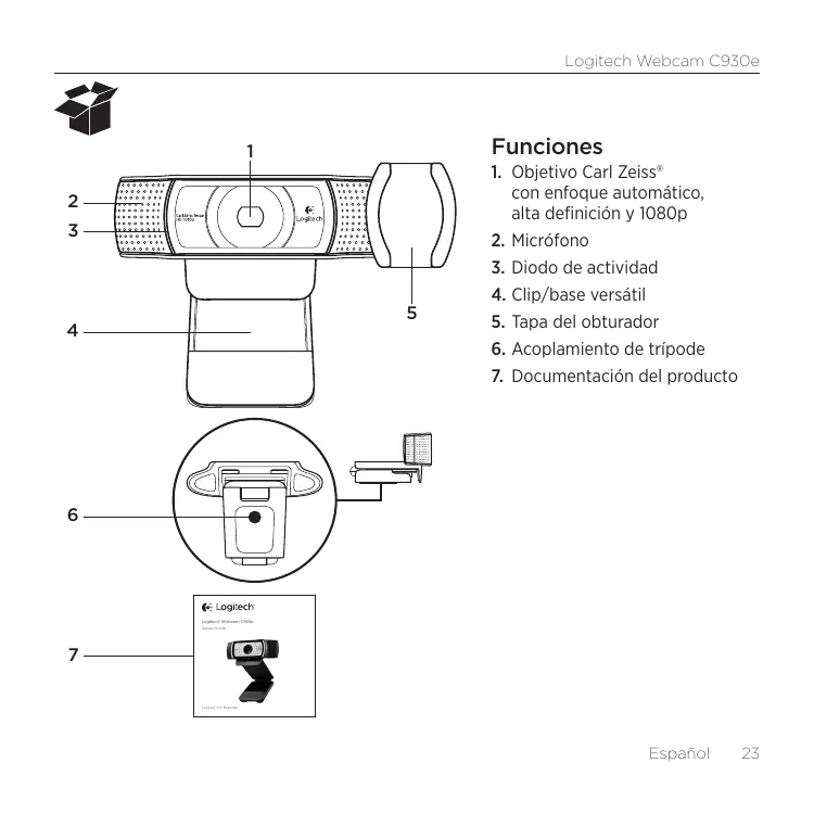 2. Micrófono 3. Diodo de actividad 4. Clip/base versátil 5. Tapa del obturador 6. Acoplamiento de trípode 7. Documentación del producto