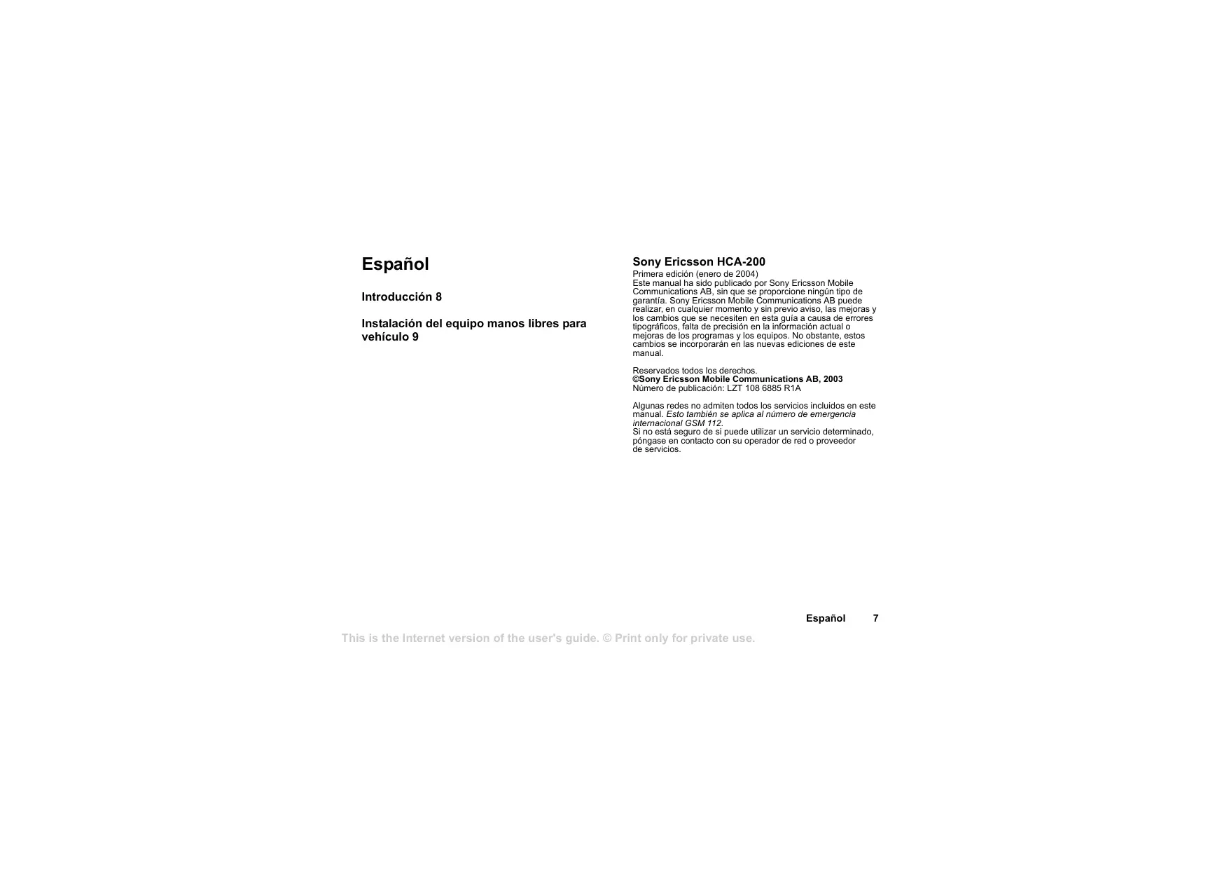 Español Introducción 8 Instalación del equipo manos libres para vehículo 9 Sony Ericsson HCA-200 Primera edición (enero de 2004) Este manual ha sido publicado por Sony Ericsson Mobile Communications AB, sin que se proporcione ningún tipo de garantía. Sony Ericsson Mobile Communications AB puede realizar, en cualquier momento y sin previo aviso, las mejoras y los cambios que se necesiten en esta guía a causa de errores tipográficos, falta de precisión en la información actual o mejoras de los programas y los equipos. No obstante, estos cambios se incorporarán en las nuevas ediciones de este manual. Reservados todos los derechos. ©Sony Ericsson Mobile Communications AB, 2003 Número de publicación: LZT 108 6885 R1A Algunas redes no admiten todos los servicios incluidos en este manual. Esto también se aplica al número de emergencia internacional GSM 112. Si no está seguro de si puede utilizar un servicio determinado, póngase en contacto con su operador de red o proveedor de servicios. Español Introducción El equipo manos libres para vehículos HCA-200 ofrece una seguridad de tráfico mejorada, puesto que incorpora funciones de manos libres y una calidad de sonido sostenida con eliminación de ecos y ruidos. También permite cargar la batería rápidamente. Lea atentamente el texto que figura en la sección “Información adicional” de la guía de usuario del HCA-200 antes de utilizar su equipo manos libres para vehículo. Accesorios Para mejorar en mayor medida el uso del equipo manos libres para vehículos HCA-200, le recomendamos los siguientes accesorios: