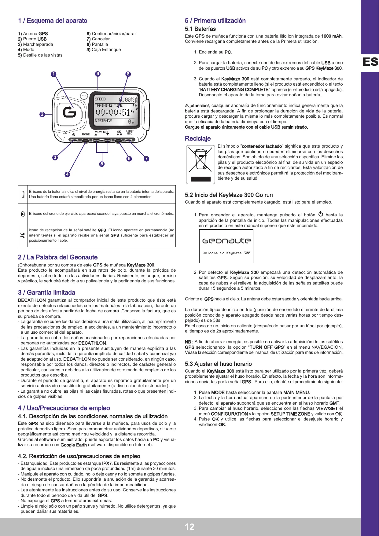 - Estanqueidad: Este producto es estanque IPX7. Es resistente a las proyecciones de agua e incluso una inmersión de poca profundidad (1m) durante 30 minutos. - Manipule el aparato con cuidado, no lo deje caer y no lo someta a golpes fuertes. - No desmonte el producto. Ello supondría la anulación de la garantía y acarrearía el riesgo de causar daños o la pérdida de la impermeabilidad. - Lea atentamente las instrucciones antes de su uso. Conserve las instrucciones durante todo el período de vida útil del GPS. - No exponga el GPS a temperaturas extremas. - Limpie el reloj sólo con un paño suave y húmedo. No utilice detergentes, ya que pueden dañar sus materiales.