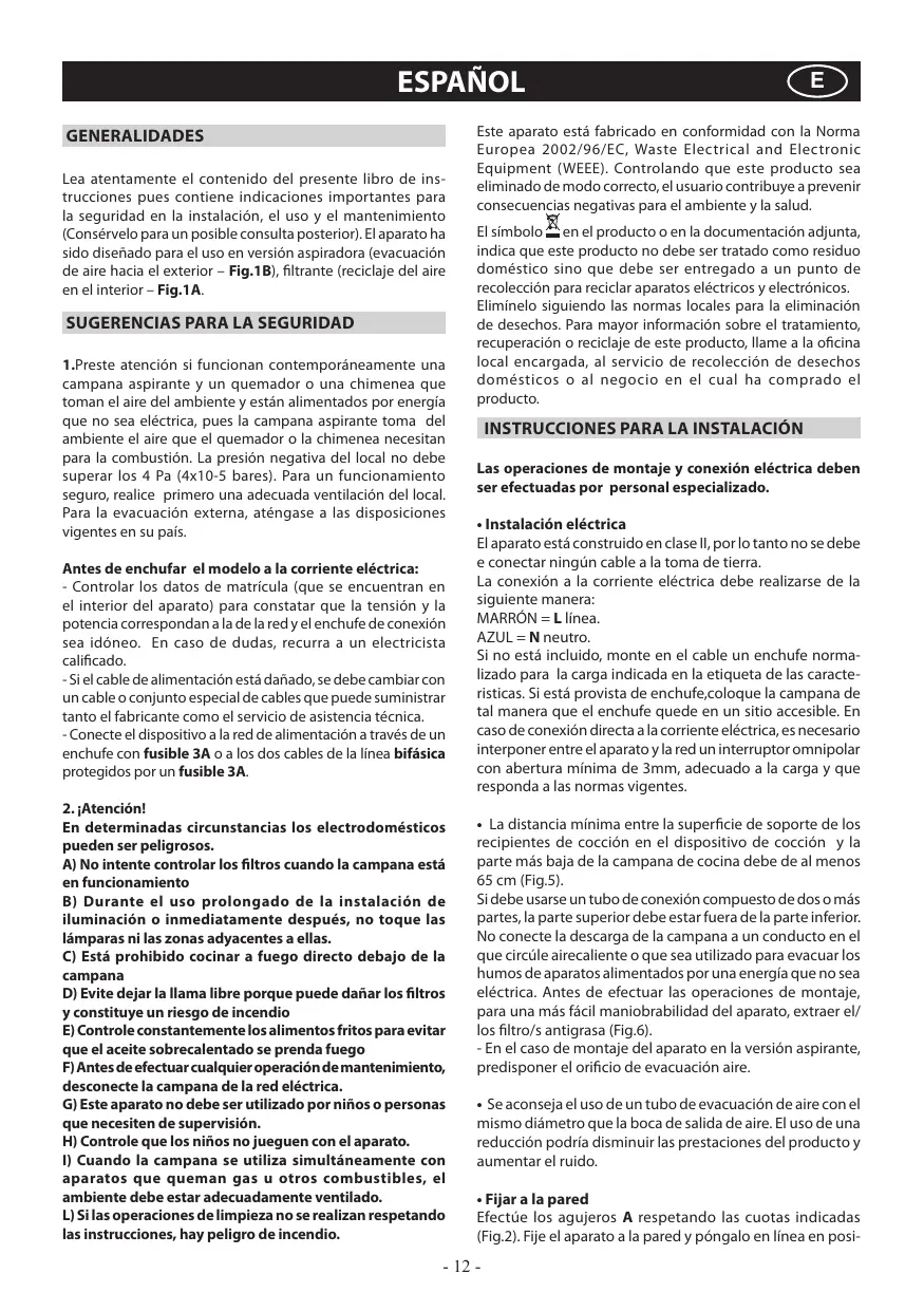 Lea atentamente el contenido del presente libro de instrucciones que contieneindicaciones importantes para la seguidad en la instalacion, el uso y el mantenimiento (Conservelo para un possible consulta posterior).El aparato ha sido designado para el uso en version aspiradora (evacuacion de aire hacel exterior-Fig.1B),filtrante (reciclaje del aire en el interior-Fig.1A.