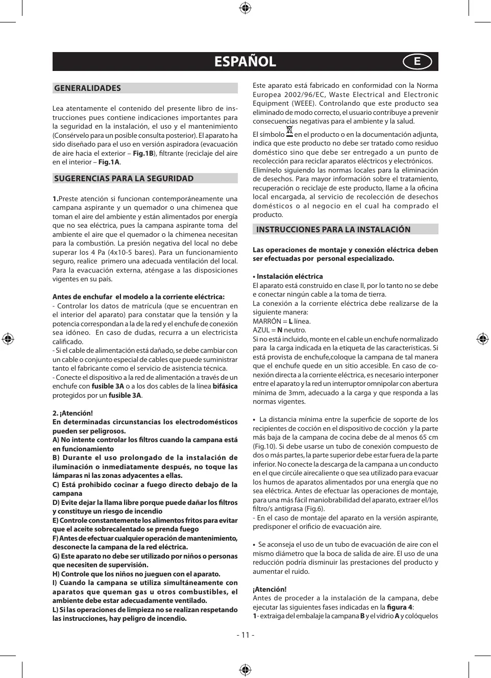Lea atentamente el contenido del presente libro de instrucciones puis contieneindicaciones importantes para la seguidad en la instalacion, el uso y el mantenimiento (Conservelo para un possible consulta posterior).El aparato ha sido disenado por el uso en version aspiradora (evacuacion de aire desde el exterior-Fig.1B),filtrante (reciclaje del aire en el interior-Fig.1A.