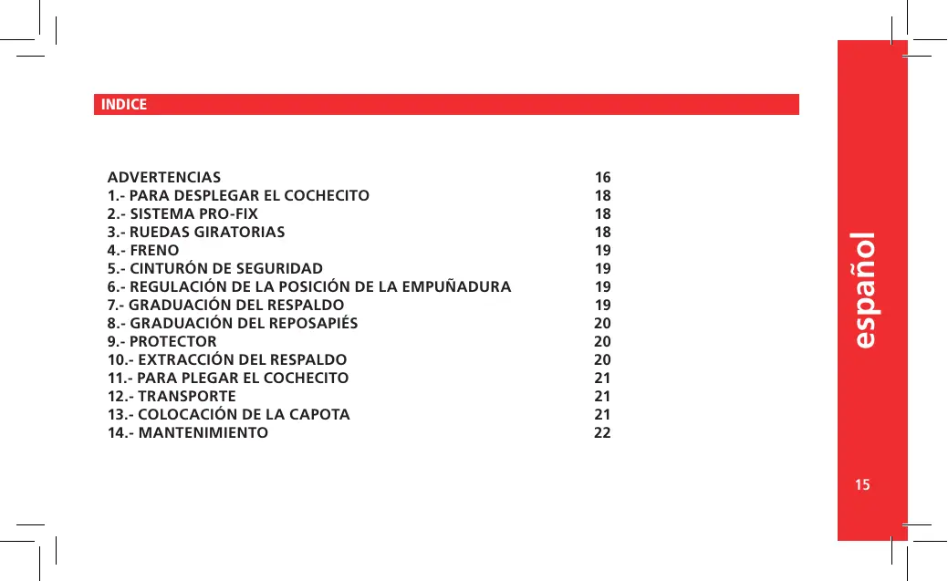 ADVERTENCIAS 1.- PARA DESPLEGAR EL COCHECITO 2.- SISTEMA PRO-FIX 3.- RUEDAS GIRATORIAS 4.- FRENO 5.- CINTURÓN DE SEGURIDAD 6.- REGULACIÓN DE LA POSICIÓN DE LA EMPUÑADURA 7.- GRADUACIÓN DEL RESPALDO 8.- GRADUACIÓN DEL REPOSAPIÉS 9.- PROTECTOR 10.- EXTRACCIÓN DEL RESPALDO 11.- PARA PLEGAR EL COCHECITO 12.- TRANSPORTE 13.- COLOCACIÓN DE LA CAPOTA 14.- MANTENIMIENTO