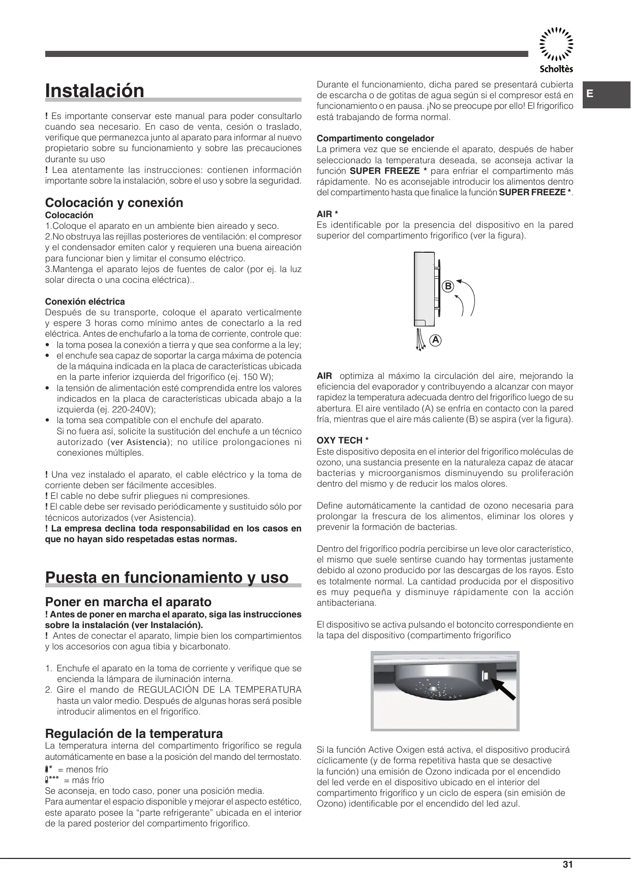 Durante el funcionamiento, dicha pared se presentará cubierta de escarcha o de gotitas de agua según si el compresor está en funcionamiento o en pausa. ¡No se preocupe por ello! El frigorífico está trabajando de forma normal. Compartimento congelador La primera vez que se enciende el aparato, después de haber seleccionado la temperatura deseada, se aconseja activar la función SUPER FREEZE * para enfriar el compartimento más rápidamente. No es aconsejable introducir los alimentos dentro del compartimento hasta que finalice la función SUPER FREEZE *. AIR * Es identificable por la presencia del dispositivo en la pared superior del compartimento frigorífico (ver la figura).