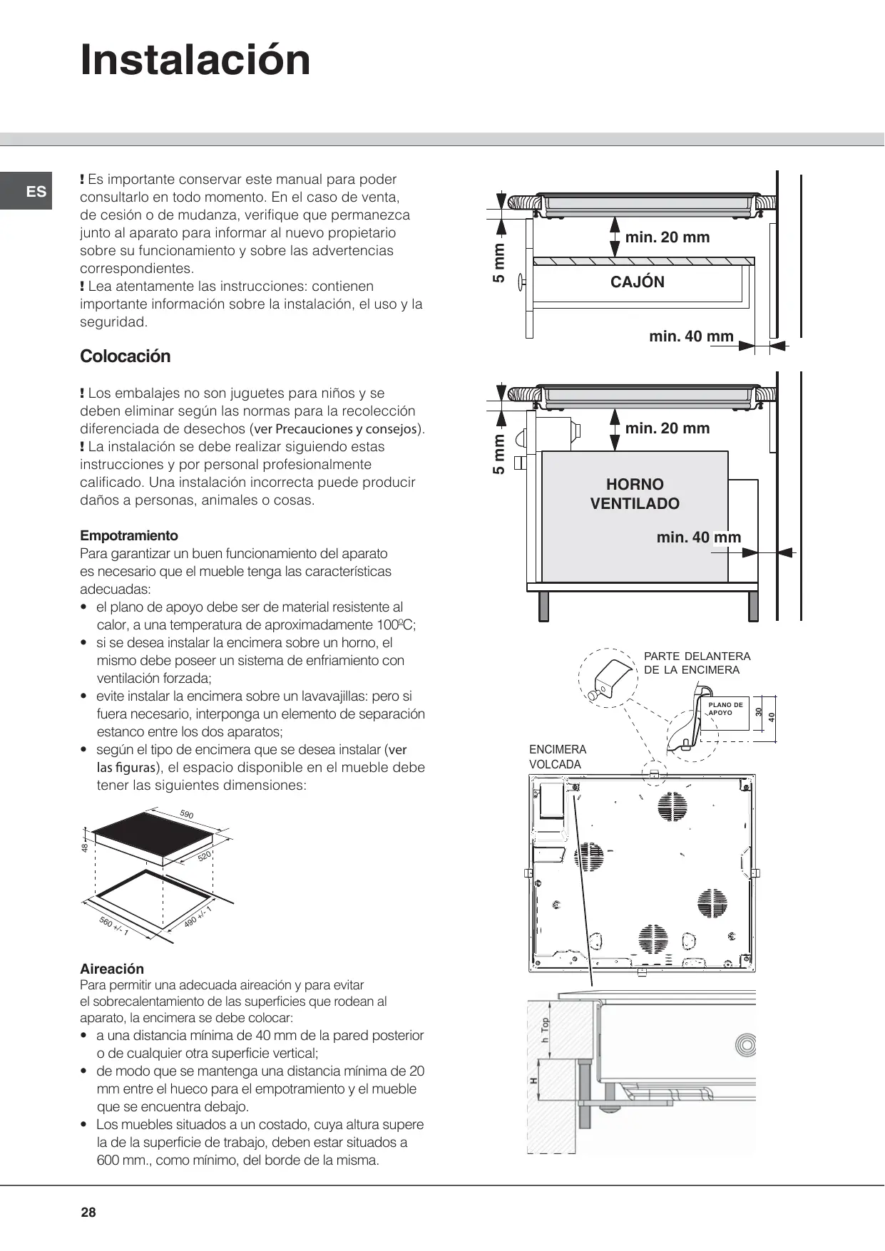 Para garantizar un buen funcionamiento del aparato es necesario que el mueble tenga las características adecuadas: • el plano de apoyo debe ser de material resistente al calor, a una temperatura de aproximadamente 100ºC; • si se desea instalar la encimera sobre un horno, el mismo debe poseer un sistema de enfriamiento con ventilación forzada; • evite instalar la encimera sobre un lavavajillas: pero si fuera necesario, interponga un elemento de separación estanco entre los dos aparatos; • según el tipo de encimera que se desea instalar (ver las figuras), el espacio disponible en el mueble debe tener las siguientes dimensiones: