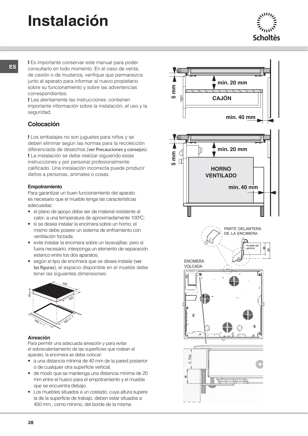 CHALEUR TOURNANTE min. 40 mm Instalación ! Es importante conservar este manual para poder min. 20 mm 5 mm consultarlo en todo momento. En el caso de venta, de cesión o de mudanza, verifique que permanezca junto al aparato para informar al nuevo propietario sobre su funcionamiento y sobre las advertencias correspondientes. ! Lea atentamente las instrucciones: contienen importante información sobre la instalación, el uso y la seguridad. CAJÓN min. 40 mm Colocación