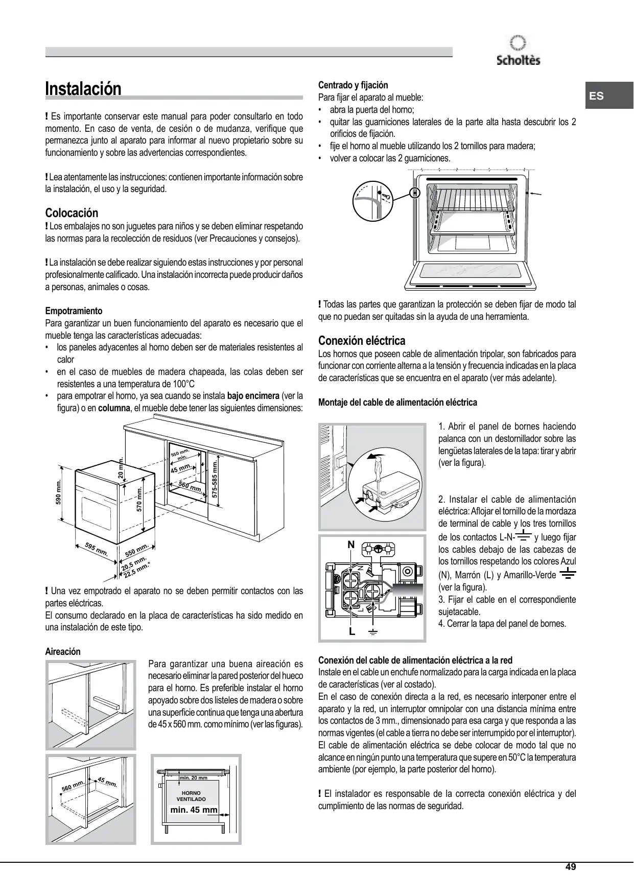 Conexión eléctrica min. 20 mm HORNO VENTILADO min. 45 mm
