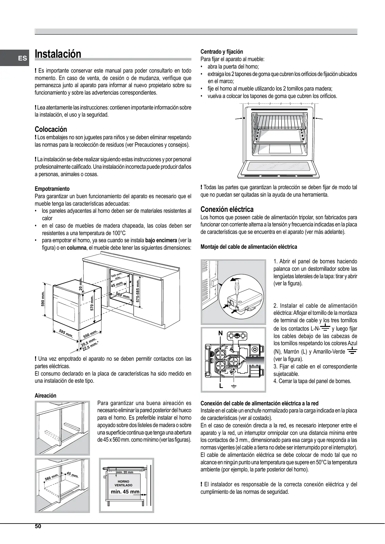Para garantizar una buena aireación es necesario eliminar la pared posterior del hueco para el horno. Es preferible instalar el horno apoyado sobre dos listeles de madera o sobre una superficie continua que tenga una abertura de 45 x 560 mm. como mínimo (ver las figuras).