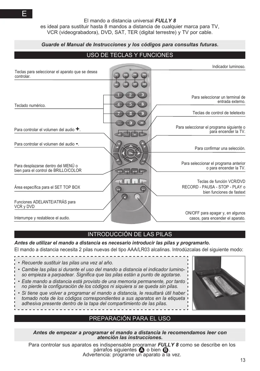 El mando a distancia universal FULLY 8 es ideal para sustituir hasta 8 mandos a distancia de cualquier marca para TV, VCR (videograbadora), DVD, SAT, TER (digital terrestre) y TV por cable. Guarde el Manual de Instrucciones y los códigos para consultas futuras.